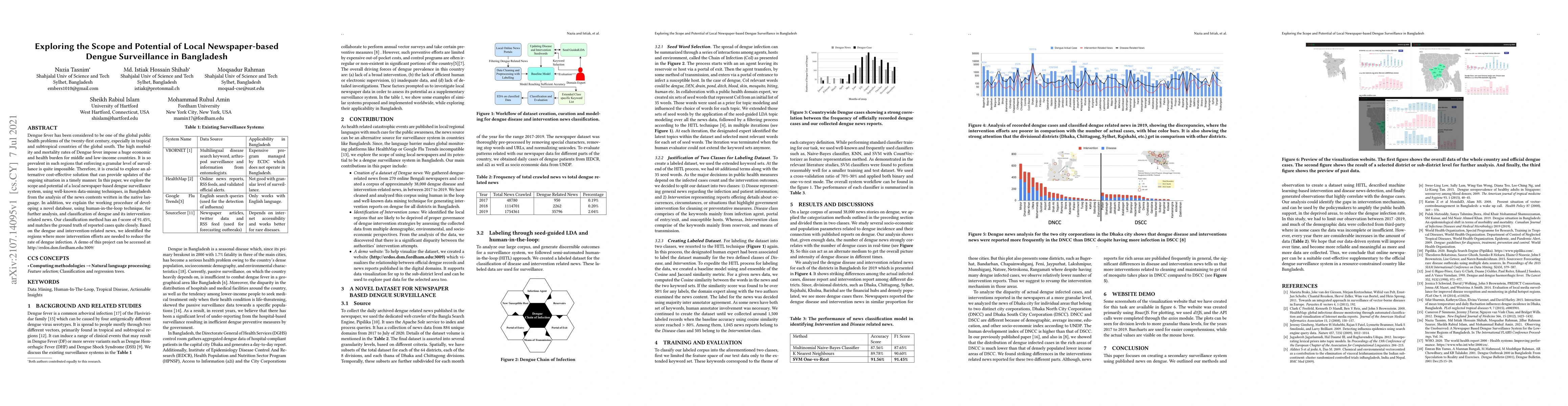 Dengue fever has been considered to be one of the global public health problems of the twenty-first century, especially in tropical and subtropical countries of the global south. The high morbidity and mortality rates of Dengue fever impose a huge economic and health burden for middle and low-income countries. It is so prevalent in such regions that enforcing a granular level of surveillance is quite impossible. Therefore, it is crucial to explore an alternative cost-effective solution that can provide updates of the ongoing situation in a timely manner. In this paper, we explore the scope and potential of a local newspaper-based dengue surveillance system, using well-known data-mining techniques, in Bangladesh from the analysis of the news contents written in the native language. In addition, we explain the working procedure of developing a novel database, using human-in-the-loop technique, for further analysis, and classification of dengue and its intervention-related news. Our classification method has an f-score of 91.45%, and matches the ground truth of reported cases quite closely. Based on the dengue and intervention-related news, we identified the regions where more intervention efforts are needed to reduce the rate of dengue infection. A demo of this project can be accessed at: http://erdos.dsm.fordham.edu:3009/