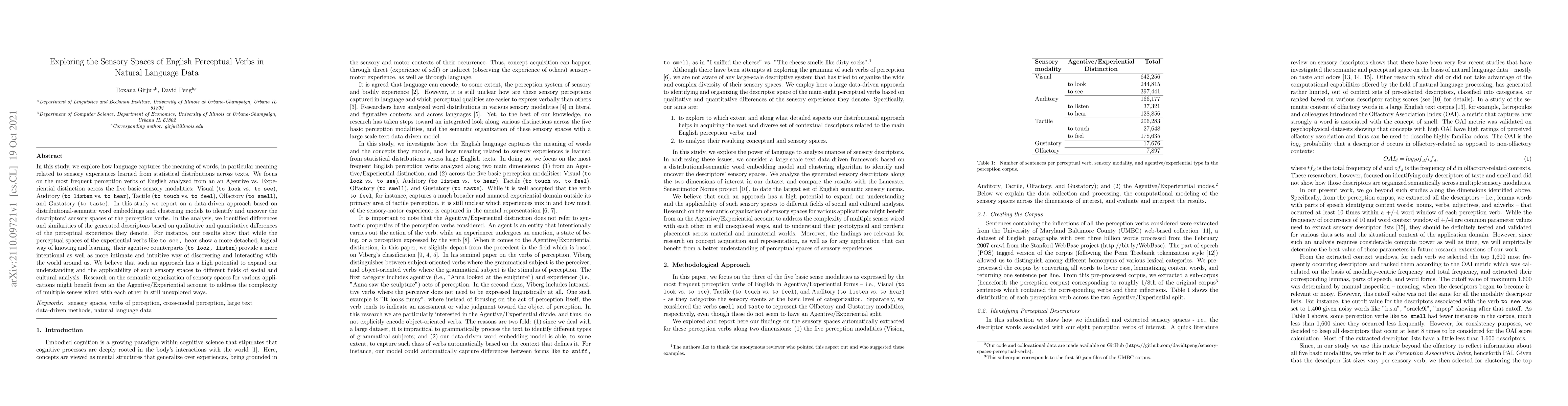 In this study, we explore how language captures the meaning of words, in particular meaning related to sensory experiences learned from statistical distributions across texts. We focus on the most frequent perception verbs of English analyzed from an and Agentive vs. Experiential distinction across the five basic sensory modalities: Visual (to look vs. to see), Auditory (to listen vs. to hear), Tactile (to touch vs. to feel), Olfactory (to smell), and Gustatory (to taste). In this study we report on a data-driven approach based on distributional-semantic word embeddings and clustering models to identify and uncover the descriptor sensory spaces of the perception verbs. In the analysis, we identified differences and similarities of the generated descriptors based on qualitative and quantitative differences of the perceptual experience they denote. For instance, our results show that while the perceptual spaces of the experiential verbs like to see, to hear show a more detached, logical way of knowing and learning, their agentive counterparts (to look, listen) provide a more intentional as well as more intimate and intuitive way of discovering and interacting with the world around us. We believe that such an approach has a high potential to expand our understanding and the applicability of such sensory spaces to different fields of social and cultural analysis. Research on the semantic organization of sensory spaces for various applications might benefit from an the Agentive/Experiential account to address the complexity of multiple senses wired with each other in still unexplored ways.