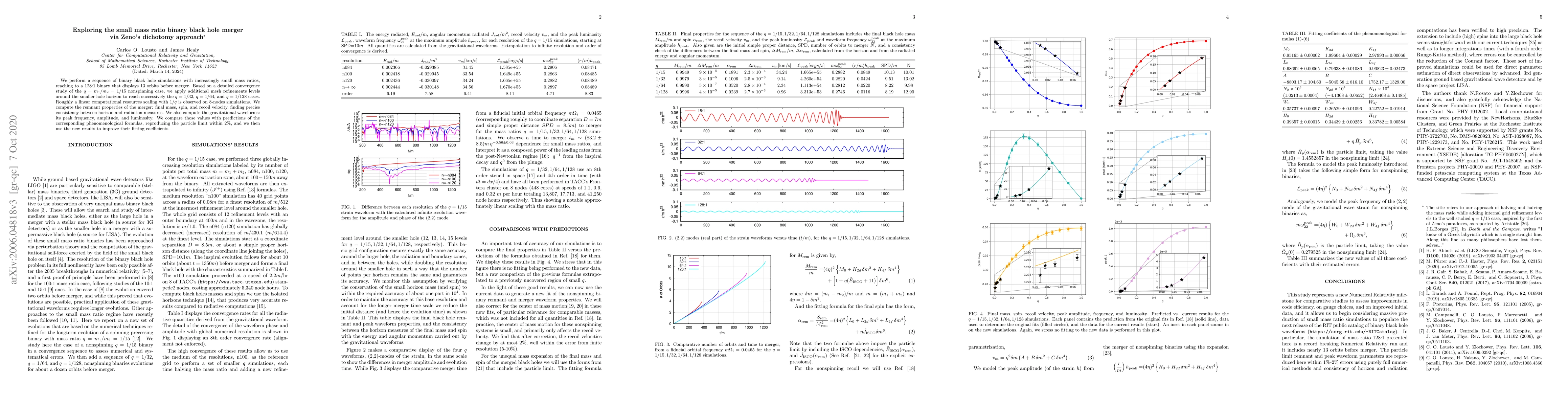 We perform a sequence of binary black hole simulations with increasingly small mass ratios, reaching to a 128:1 binary that displays 13 orbits before merger. Based on a detailed convergence study of the $q=m_1/m_2=1/15$ nonspinning case, we apply additional mesh refinements levels around the smaller hole horizon to reach successively the $q=1/32$, $q=1/64$, and $q=1/128$ cases. Roughly a linear computational resources scaling with $1/q$ is observed on 8-nodes simulations. We compute the remnant properties of the merger: final mass, spin, and recoil velocity, finding precise consistency between horizon and radiation measures. We also compute the gravitational waveforms: its peak frequency, amplitude, and luminosity. We compare those values with predictions of the corresponding phenomenological formulas, reproducing the particle limit within 2%, and we then use the new results to improve their fitting coefficients.