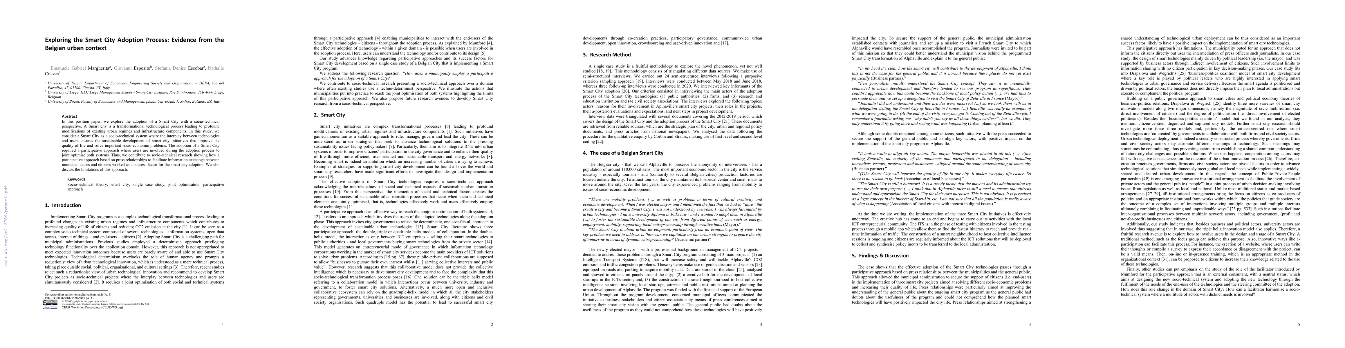 This paper examines the adoption of Smart City initiatives in Belgium through a socio-technical lens, emphasizing the importance of user participation in optimizing urban systems. It highlights the success of press relationships in facilitating information exchange and discusses the limitations of this participative approach.