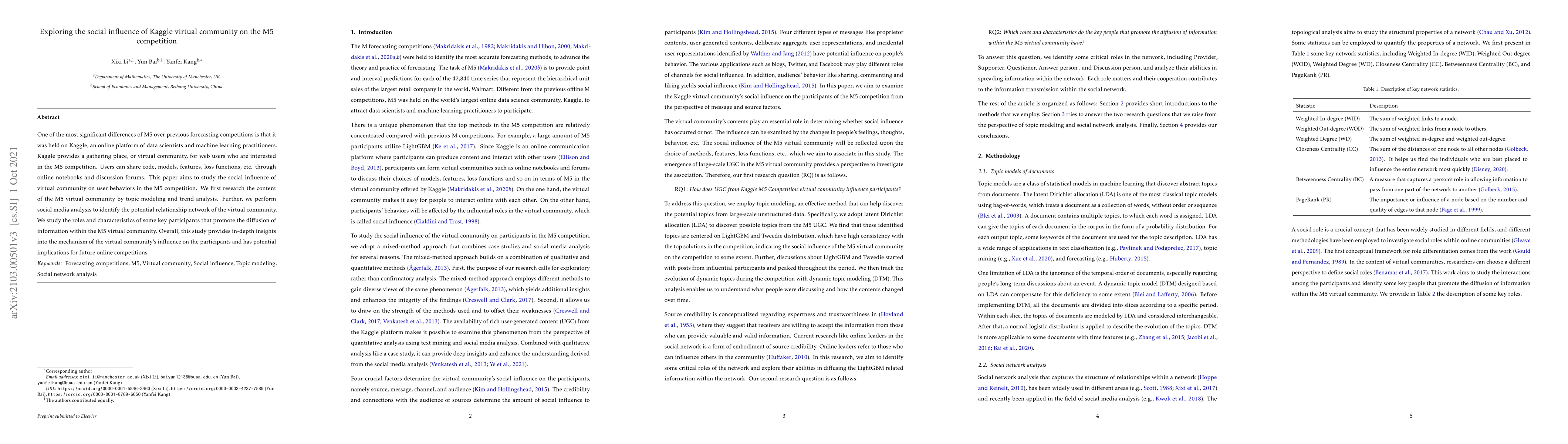 This paper investigates how the Kaggle virtual community influences participant behavior in the M5 competition through social media analysis, identifying key participants and their roles in information diffusion. It provides insights into the community's impact and implications for future online competitions.