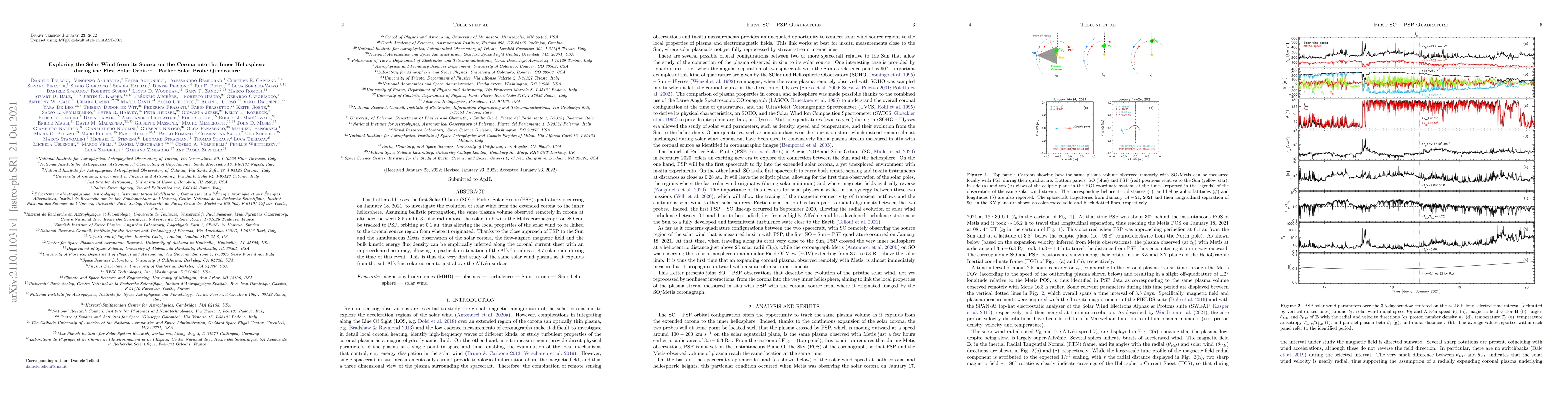 This study investigates the evolution of solar wind from the corona to the inner heliosphere using simultaneous observations from the Solar Orbiter and Parker Solar Probe during their quadrature on January 18, 2021. It provides unprecedented insights into the flow-aligned magnetic field and kinetic energy flux density, estimating the Alfvén radius at 8.7 solar radii.