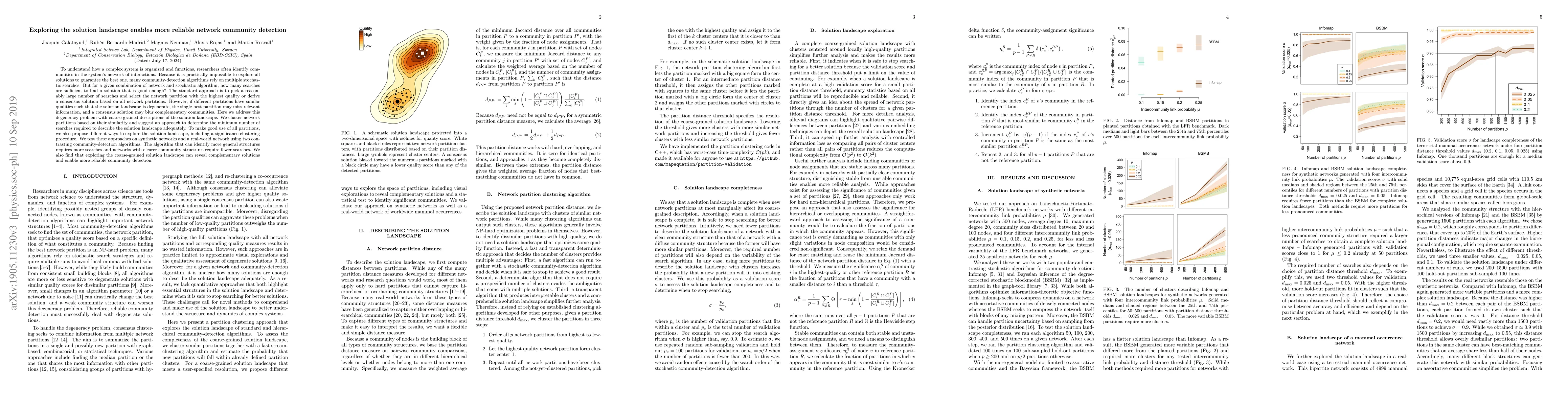 The research introduces a fast network partition clustering algorithm to describe the often degenerate solution landscape of stochastic community detection algorithms in coarse-grained form. It establishes criteria for stopping the search for better solutions and starting to explore the solution landscape, along with new statistical tests for communities and node assignments.