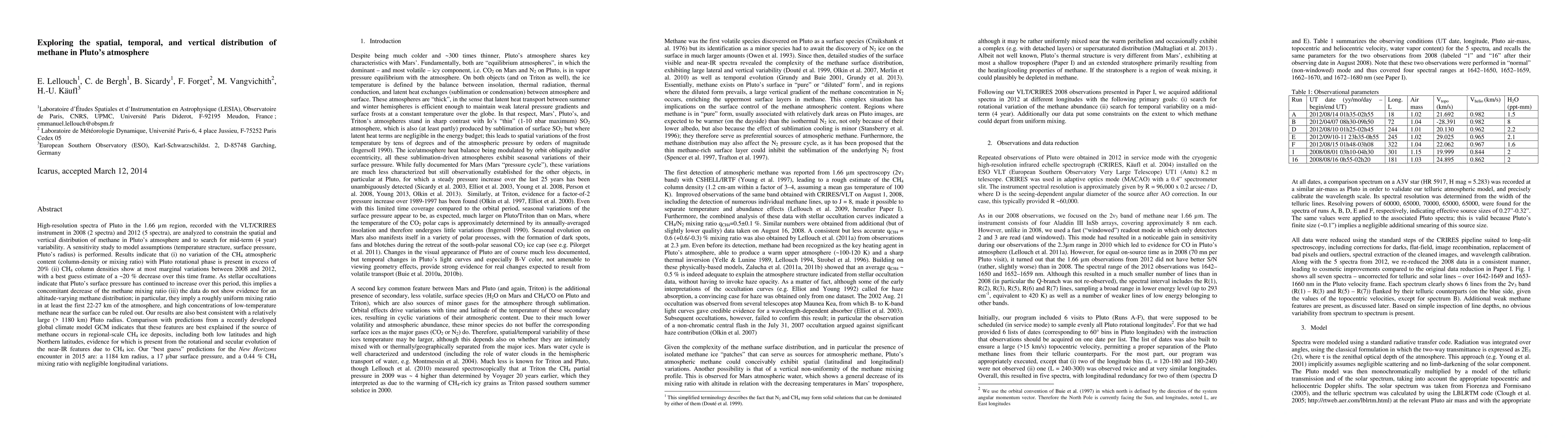This study analyzes high-resolution spectra of Pluto's atmosphere to determine methane distribution and variability over four years. Results show no significant methane variation with Pluto's rotational phase and a marginal decrease in column densities between 2008 and 2012, suggesting a decrease in methane mixing ratio due to rising surface pressure.