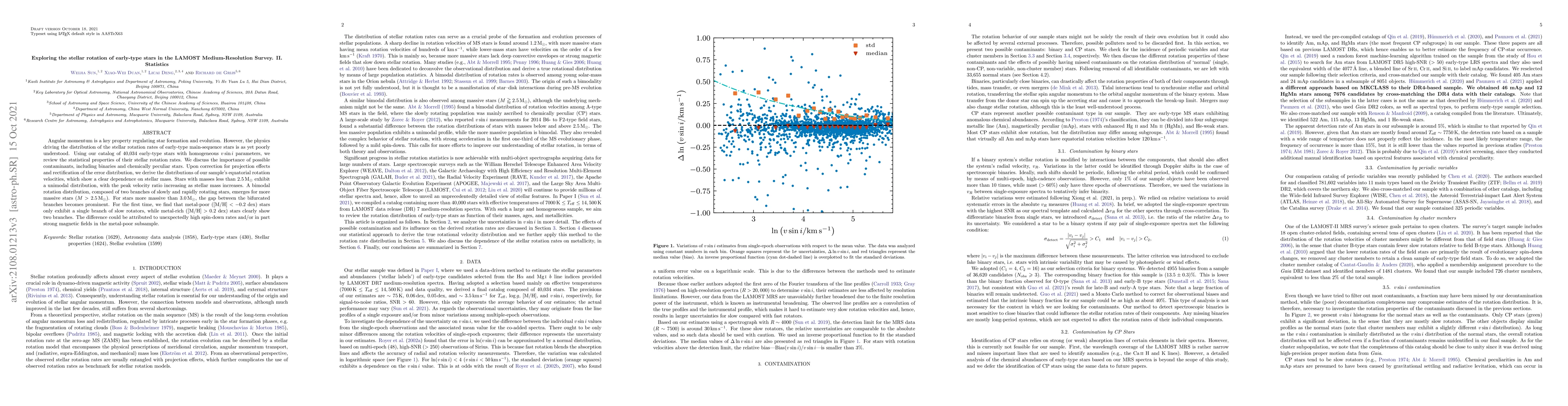 This paper analyzes the rotation of 40,034 early-type stars from the LAMOST survey, revealing a unimodal rotation distribution for stars with masses below $2.5\ {M_\odot}$ and a bimodal distribution for more massive stars. The study highlights a distinct gap in rotation rates for stars above $3.0\ {M_\odot}$ and notes a difference in rotation patterns between metal-poor and metal-rich stars.