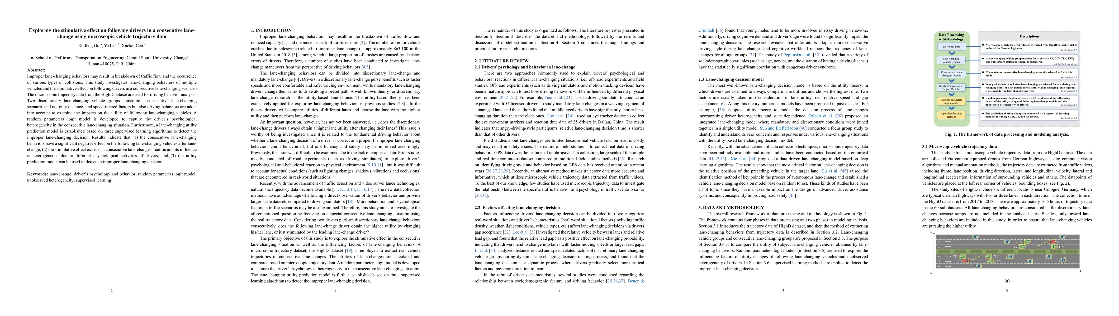 Improper lane-changing behaviors may result in breakdown of traffic flow and the occurrence of various types of collisions. This study investigates lane-changing behaviors of multiple vehicles and the stimulative effect on following drivers in a consecutive lane-changing scenario. The microscopic trajectory data from the dataset are used for driving behavior analysis.Two discretionary lane-changing vehicle groups constitute a consecutive lane-changing scenario, and not only distance- and speed-related factors but also driving behaviors are taken into account to examine the impacts on the utility of following lane-changing vehicles.A random parameters logit model is developed to capture the driver psychological heterogeneity in the consecutive lane-changing situation.Furthermore, a lane-changing utility prediction model is established based on three supervised learning algorithms to detect the improper lane-changing decision. Results indicate that (1) the consecutive lane-changing behaviors have a significant negative effect on the following lane-changing vehicles after lane-change; (2) the stimulative effect exists in a consecutive lane-change situation and its influence is heterogeneous due to different psychological activities of drivers; and (3) the utility prediction model can be used to detect an improper lane-changing decision.