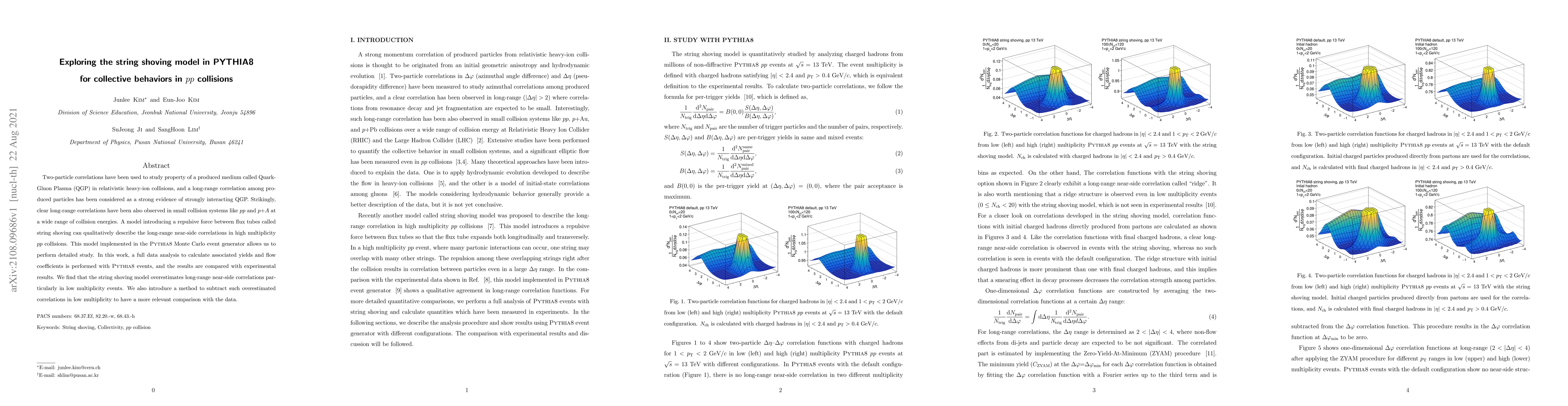 Two-particle correlations have been used to study property of a produced medium called Quark-Gluon Plasma (QGP) in relativistic heavy-ion collisions, and a long-range correlation among produced particles has been considered as a strong evidence of strongly interacting QGP. Strikingly, clear long-range correlations have been also observed in small collision systems like $pp$ and $p$+$A$ at a wide range of collision energies. A model introducing a repulsive force between flux tubes called string shoving can qualitatively describe the long-range near-side correlations in high multiplicity $pp$ collisions. This model implemented in the PYTHIA Monte Carlo event generator allows us to perform detailed study. In this work, a full data analysis to calculate associated yields and flow coefficients is performed with PYTHIA events, and the results are compared with experimental results. We find that the string shoving model overestimates long-range near-side correlations particularly in low multiplicity events. We also introduce a method to subtract such overestimated correlations in low multiplicity to have a more relevant comparison with the data.