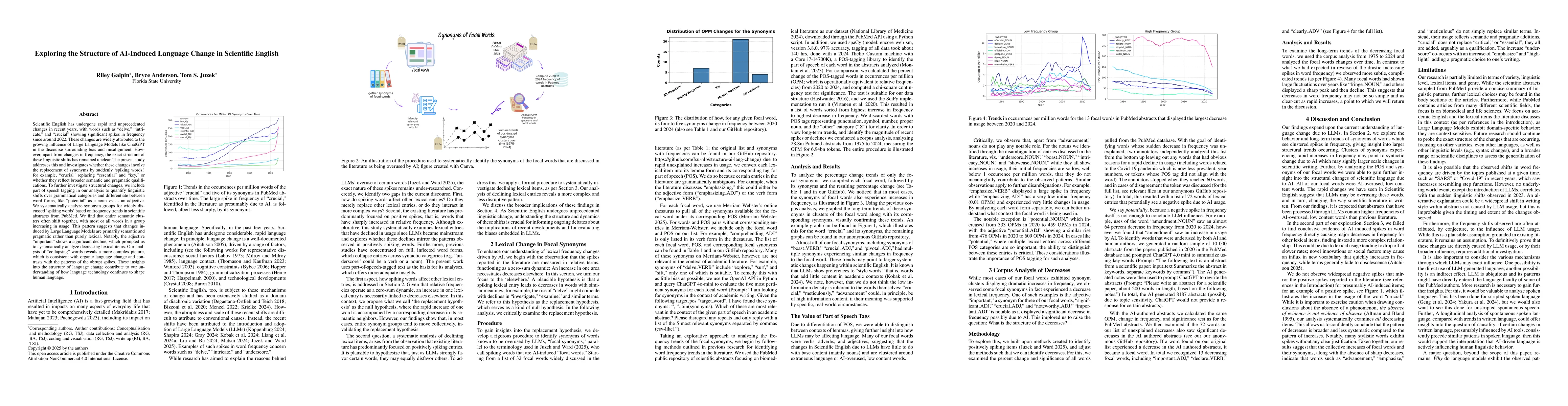 This study examines the impact of AI, particularly Large Language Models, on changes in Scientific English. Analyzing word frequency trends in PubMed abstracts, researchers found that language shifts are primarily semantic and pragmatic, involving clusters of words increasing in usage, rather than simple lexical replacements. Interestingly, some words like 'important' decrease in use, indicating a more complex pattern akin to organic language evolution.