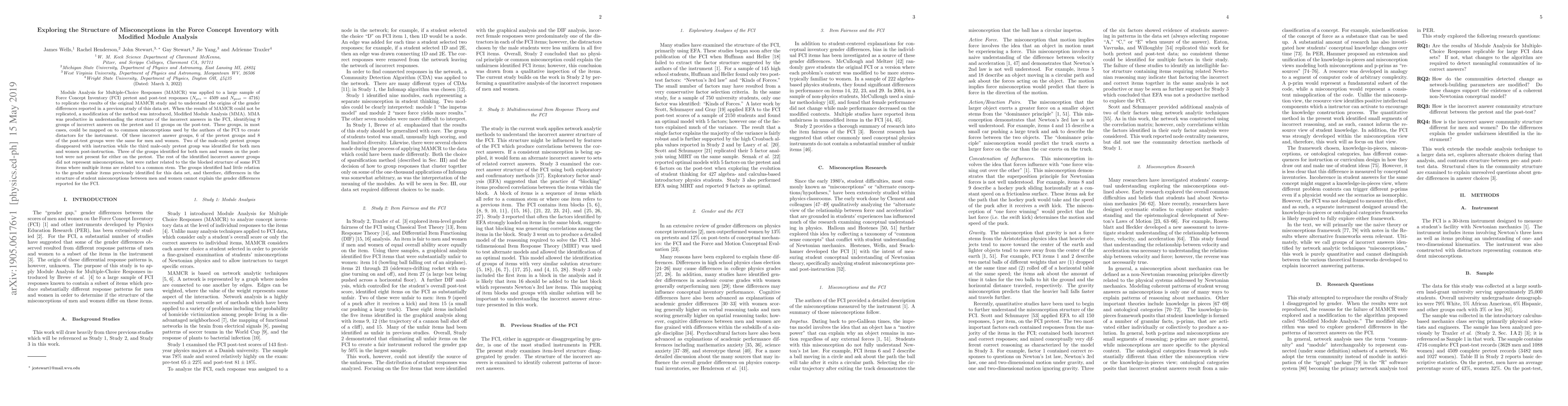 This study applied Modified Module Analysis (MMA) to Force Concept Inventory responses to identify groups of incorrect answers, revealing 9 pretest and 11 post-test groups that often mapped onto common misconceptions. The analysis showed little gender-based difference in misconception structures, suggesting these do not explain the previously reported gender disparities in FCI scores.