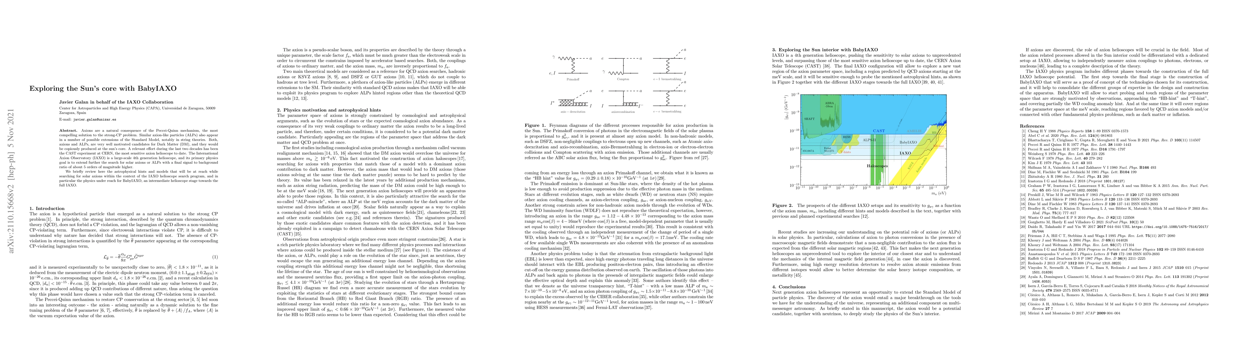 Axions are a natural consequence of the Peccei-Quinn mechanism, the most compelling solution to the strong-CP problem. Similar axion-like particles (ALPs) also appear in a number of possible extensions of the Standard Model, notably in string theories. Both, axions and ALPs, are very well motivated candidates for Dark Matter (DM), and they would be copiously produced at the suns core. A relevant effort during the last two decades has been the CAST experiment at CERN, the most sensitive axion helioscope to date. The International Axion Observatory (IAXO) is a large-scale 4th generation helioscope, and its primary physics goal is to extend further the search for solar axions or ALPs with a final signal to background ratio of about 5 orders of magnitude higher. We briefly review here the astrophysical hints and models that will be at reach while searching for solar axions within the context of the IAXO helioscope search program, and in particular the physics under reach for BabyIAXO, an intermediate helioscope stage towards the full IAXO.