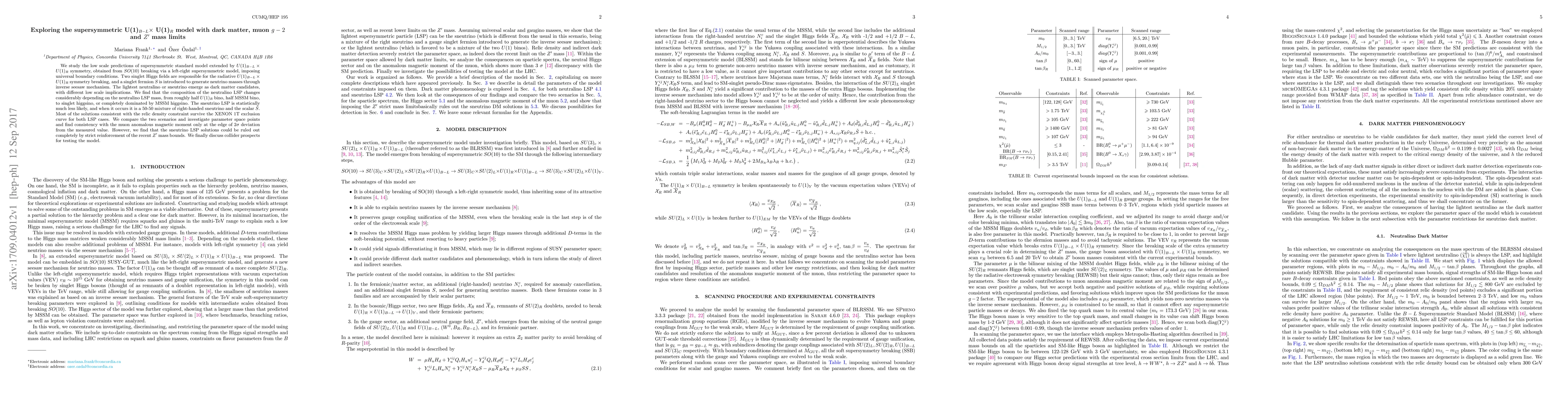 This paper explores a supersymmetric U(1)$_{B-L} \times$ U(1)$_{R}$ model extended from SO(10) breaking, focusing on dark matter candidates, muon $g-2$, and $Z^\prime$ mass limits. The lightest neutralino or sneutrino serves as potential dark matter, with the neutralino's composition varying significantly based on its mass. The model is consistent with relic density and muon $g-2$ but may be ruled out by stricter $Z^\prime$ mass constraints.