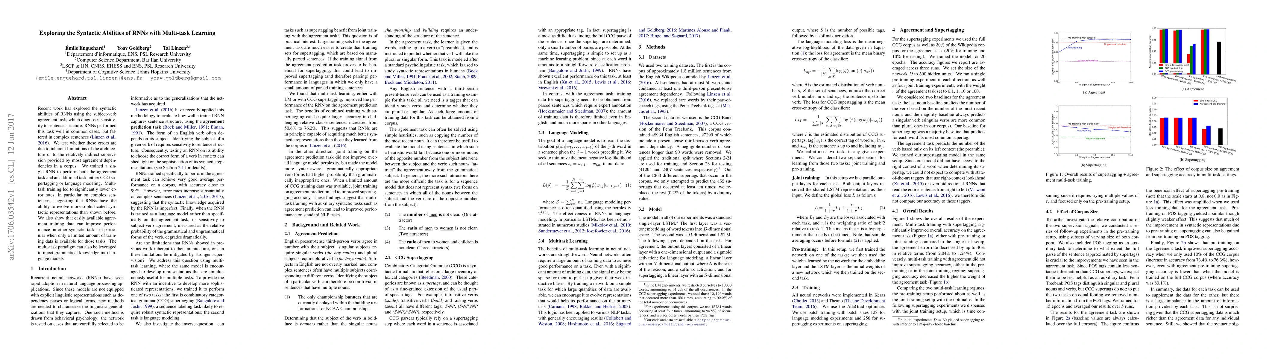Recent work has explored the syntactic abilities of RNNs using the subject-verb agreement task, which diagnoses sensitivity to sentence structure. RNNs performed this task well in common cases, but faltered in complex sentences (Linzen et al., 2016). We test whether these errors are due to inherent limitations of the architecture or to the relatively indirect supervision provided by most agreement dependencies in a corpus. We trained a single RNN to perform both the agreement task and an additional task, either CCG supertagging or language modeling. Multi-task training led to significantly lower error rates, in particular on complex sentences, suggesting that RNNs have the ability to evolve more sophisticated syntactic representations than shown before. We also show that easily available agreement training data can improve performance on other syntactic tasks, in particular when only a limited amount of training data is available for those tasks. The multi-task paradigm can also be leveraged to inject grammatical knowledge into language models.