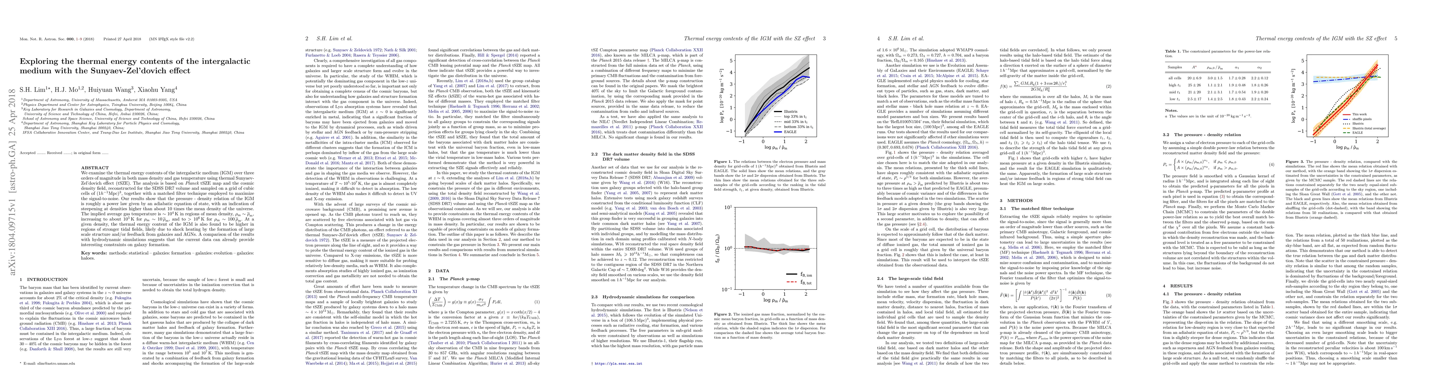 This paper investigates the thermal energy in the intergalactic medium (IGM) using the thermal Sunyaev-Zel'dovich effect, revealing a power-law pressure-density relation and an average gas temperature of $10^4$ K in mean density regions, rising to $>10^6$ K in denser regions. The study also finds higher thermal energy in areas with stronger tidal forces, suggesting shock heating and feedback from galaxies and AGNs.