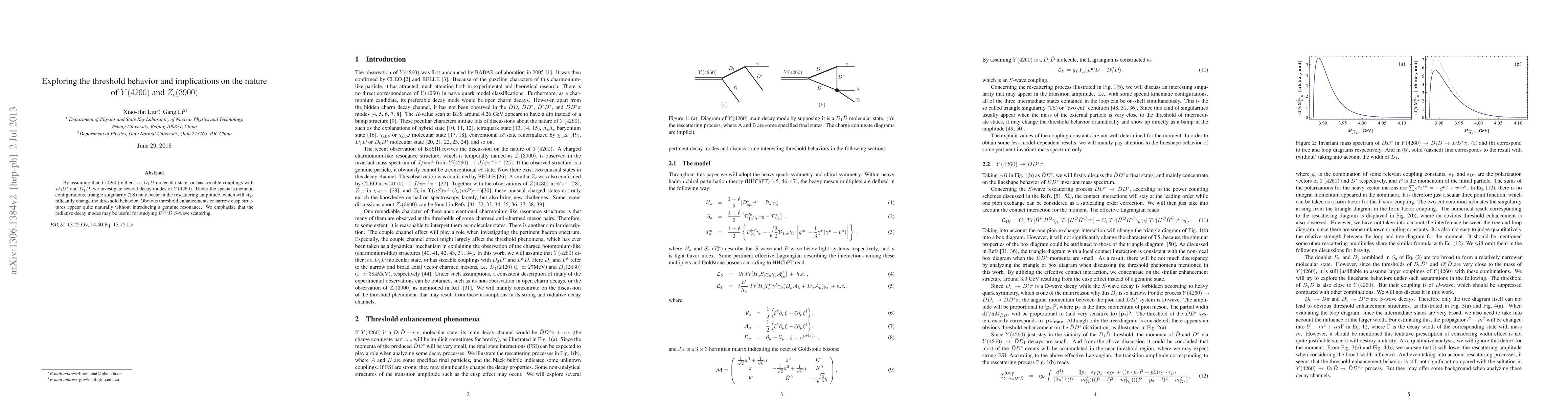 By assuming that Y(4260) either is a $D_1\bar{D}$ molecular state, or has sizeable couplings with $D_0 \bar{D}^*$ and $D_1^\prime \bar{D}$, we investigate several decay modes of Y(4260). Under the special kinematic configurations, triangle singularity (TS) may occur in the rescattering amplitude, which will significantly change the threshold behavior. Obvious threshold enhancements or narrow cusp structures appear quite naturally without introducing a genuine resonance. We emphasize that the radiative decay modes may be useful for studying $D^{(*)}\bar{D}$ $S$-wave scattering.