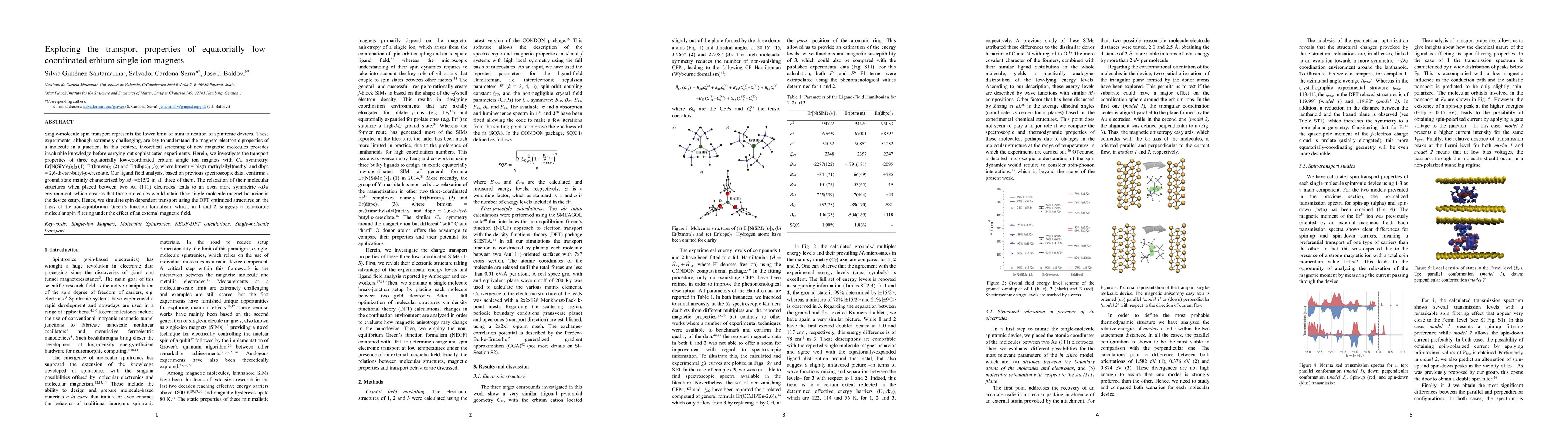 Single-molecule spin transport represents the lower limit of miniaturization of spintronic devices. These experiments, although extremely challenging, are key to understand the magneto-electronic properties of a molecule in a junction. In this context, theoretical screening of new magnetic molecules provides invaluable knowledge before carrying out sophisticated experiments. Herein, we investigate the transport properties of three equatorially low-coordinated erbium single ion magnets with $C_{3v}$ symmetry: Er[N(SiMe$_3$)$_2$]$_3$ (1), Er(btmsm)$_3$ (2) and Er(dbpc)$_3$ (3), where btmsm = bis(trimethylsilyl)methyl and dbpc = 2,6-di-tert-butyl-p-cresolate. Our ligand field analysis, based on previous spectroscopic data, confirms a ground state mainly characterized by $M_J$ =$\pm$15/2 in all three of them. The relaxation of their molecular structures when placed between two Au (111) electrodes leads to an even more symmetric $\sim D_{3h}$ environment, which ensures that these molecules would retain their single-molecule magnet behavior in the device setup. Hence, we simulate spin dependent transport using the DFT optimized structures on the basis of the non-equilibrium Green's function formalism, which, in 1 and 2, suggests a remarkable molecular spin filtering under the effect of an external magnetic field.