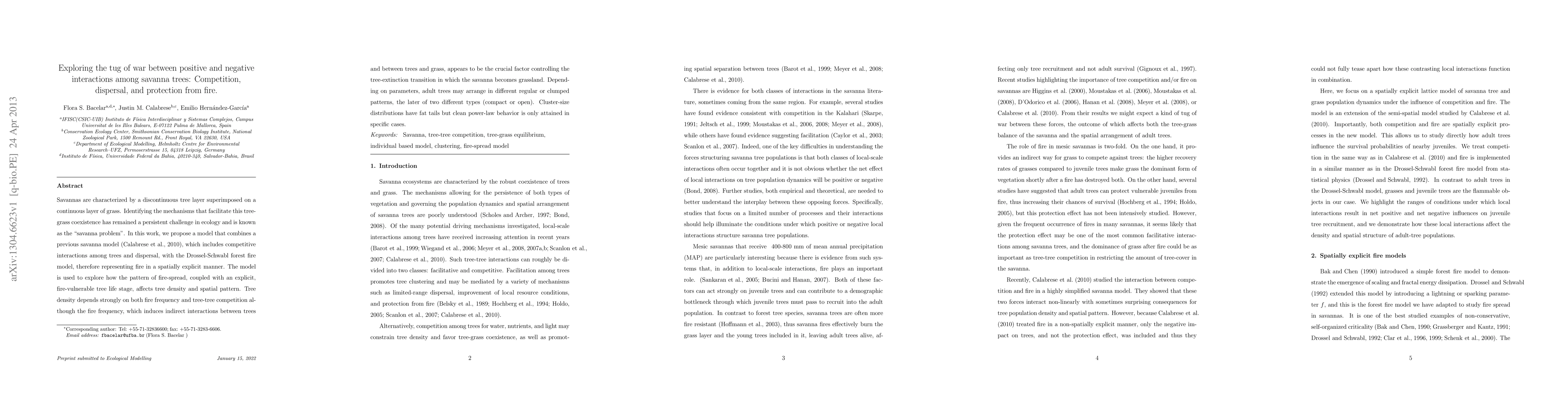 Savannas are characterized by a discontinuous tree layer superimposed on a continuous layer of grass. Identifying the mechanisms that facilitate this tree-grass coexistence has remained a persistent challenge in ecology and is known as the "savanna problem". In this work, we propose a model that combines a previous savanna model (Calabrese et al., 2010), which includes competitive interactions among trees and dispersal, with the Drossel-Schwabl forest fire model, therefore representing fire in a spatially explicit manner. The model is used to explore how the pattern of fire-spread, coupled with an explicit, fire-vulnerable tree life stage, affects tree density and spatial pattern. Tree density depends strongly on both fire frequency and tree-tree competition although the fire frequency, which induces indirect interactions between trees and between trees and grass, appears to be the crucial factor controlling the tree-extinction transition in which the savanna becomes grassland. Depending on parameters, adult trees may arrange in different regular or clumped patterns, the later of two different types (compact or open). Cluster-size distributions have fat tails but clean power-law behavior is only attained in specific cases.