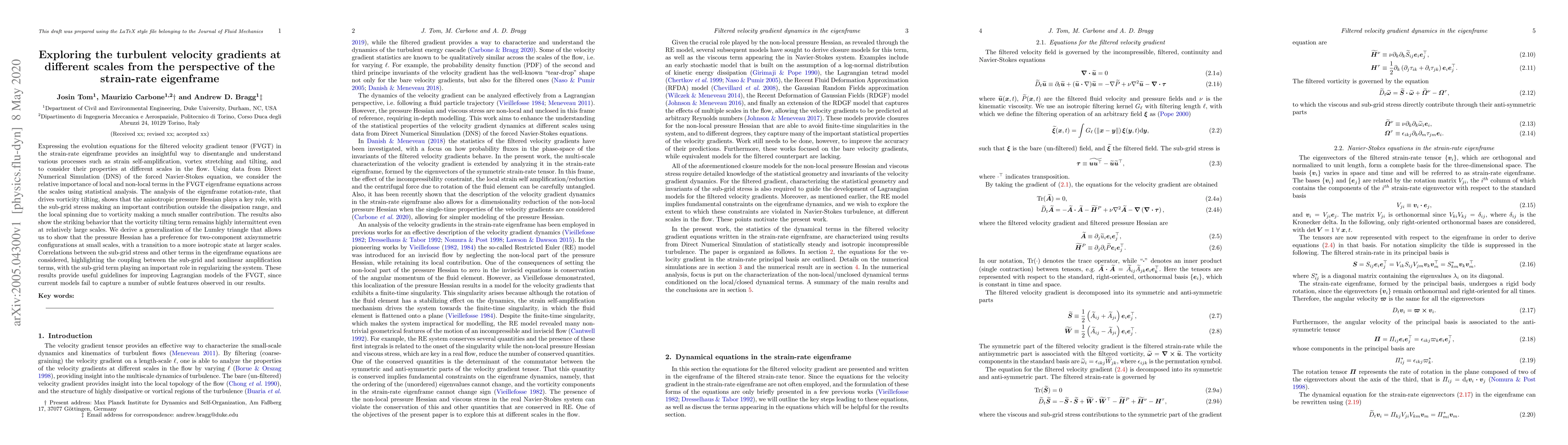 Expressing the evolution equations for the filtered velocity gradient tensor (FVGT) in the strain-rate eigenframe provides an insightful way to disentangle and understand various processes such as strain self-amplification, vortex stretching and tilting, and to consider their properties at different scales in the flow. Using data from Direct Numerical Simulation (DNS) of the forced Navier-Stokes equation, we consider the relative importance of local and non-local terms in the FVGT eigenframe equations across the scales using statistical analysis. The analysis of the eigenframe rotation-rate, that drives vorticity tilting, shows that the anisotropic pressure Hessian plays a key role, with the sub-grid stress making an important contribution outside the dissipation range, and the local spinning due to vorticity making a much smaller contribution. The results also show the striking behavior that the vorticity tilting term remains highly intermittent even at relatively large scales. We derive a generalization of the Lumley triangle that allows us to show that the pressure Hessian has a preference for two-component axisymmetric configurations at small scales, with a transition to a more isotropic state at larger scales. Correlations between the sub-grid stress and other terms in the eigenframe equations are considered, highlighting the coupling between the sub-grid and nonlinear amplification terms, with the sub-grid term playing an important role in regularizing the system. These results provide useful guidelines for improving Lagrangian models of the FVGT, since current models fail to capture a number of subtle features observed in our results.
