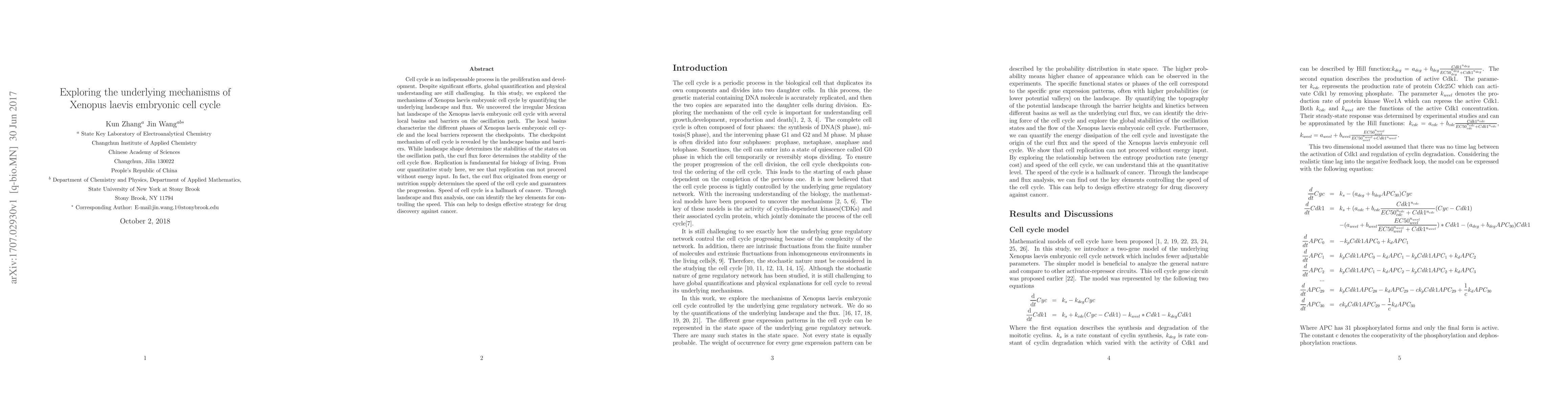 Cell cycle is an indispensable process in the proliferation and development. Despite significant efforts, global quantification and physical understanding are still challenging. In this study, we explored the mechanisms of Xenopus laevis embryonic cell cycle by quantifying the underlying landscape and flux. We uncovered the irregular Mexican hat landscape of the Xenopus laevis embryonic cell cycle with several local basins and barriers on the oscillation path. The local basins characterize the different phases of Xenopus laevis embryonic cell cycle and the local barriers represent the checkpoints. The checkpoint mechanism of cell cycle is revealed by the landscape basins and barriers. While landscape shape determines the stabilities of the states on the oscillation path, the curl flux force determines the stability of the cell cycle flow. Replication is fundamental for biology of living. From our quantitative study here, we see that replication can not proceed without energy input. In fact, the curl flux originated from energy or nutrition supply determines the speed of the cell cycle and guarantees the progression. Speed of cell cycle is a hallmark of cancer. Through landscape and flux analysis, one can identify the key elements for controlling the speed. This can help to design effective strategy for drug discovery against cancer.