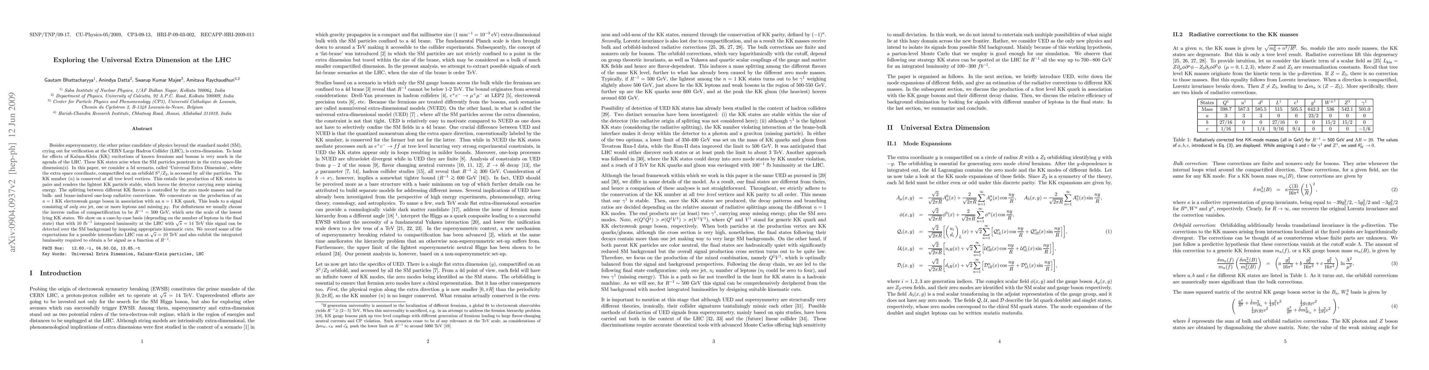 This paper investigates the potential detection of Kaluza-Klein (KK) excitations in a 5d Universal Extra Dimension scenario at the LHC, focusing on the production of an $n=1$ KK electroweak gauge boson and an $n=1$ KK quark. The study demonstrates that with 10 fb$^{-1}$ of integrated luminosity at 14 TeV, the signal of one jet, leptons, and missing $p_T$ can be distinguished from Standard Model backgrounds.