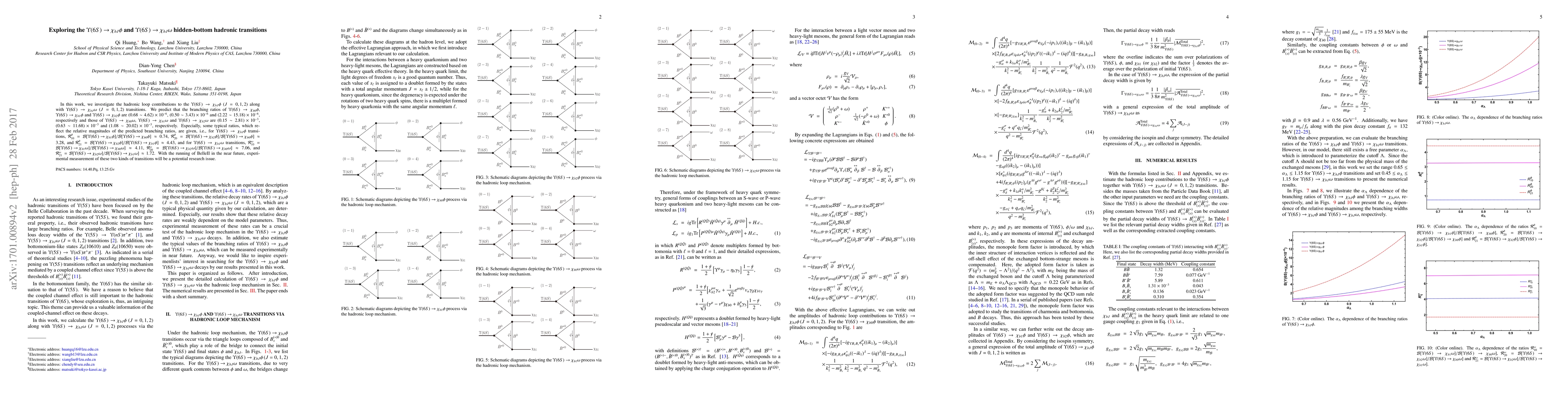 In this work, we investigate the hadronic loop contributions to the $\Upsilon(6S) \to \chi_{bJ} \phi~(J=0,1,2)$ along with $\Upsilon(6S) \to \chi_{bJ} \omega~(J=0,1,2)$ transitions. We predict that the branching ratios of $\Upsilon(6S) \to \chi_{b0} \phi$, $\Upsilon(6S) \to \chi_{b1} \phi$ and $\Upsilon(6S) \to \chi_{b2} \phi$ are $(0.68 \sim 4.62) \times 10^{-6}$, $(0.50 \sim 3.43) \times 10^{-6}$ and $(2.22 \sim 15.18) \times 10^{-6}$, respectively and those of $\Upsilon(6S) \to \chi_{b0} \omega$, $\Upsilon(6S) \to \chi_{b1} \omega$ and $\Upsilon(6S) \to \chi_{b2} \omega$ are $(0.15 \sim 2.81) \times 10^{-3}$, $(0.63 \sim 11.68) \times 10^{-3}$ and $(1.08 \sim 20.02) \times 10^{-3}$, respectively. Especially, some typical ratios, which reflect the relative magnitudes of the predicted branching ratios, are given, i.e., for $\Upsilon(6S)\to \chi_{bJ}\phi$ transitions, $\mathcal{R}^\phi_{10}={\mathcal{B}[\Upsilon(6S) \to \chi_{b1} \phi]}/{\mathcal{B}[\Upsilon(6S) \to \chi_{b0} \phi]} \approx 0.74$, $\mathcal{R}^\phi_{20}= {\mathcal{B}[\Upsilon(6S) \to \chi_{b2} \phi]}/{\mathcal{B}[\Upsilon(6S) \to \chi_{b0} \phi]} \approx 3.28$, and $\mathcal{R}^\phi_{21} = {\mathcal{B}[\Upsilon(6S) \to \chi_{b2} \phi]}/{\mathcal{B}[\Upsilon(6S) \to \chi_{b1} \phi]} \approx 4.43$, and for $\Upsilon(6S)\to \chi_{bJ}\omega$ transitions, $\mathcal{R}^\omega_{10}={\mathcal{B}[\Upsilon(6S) \to \chi_{b1} \omega]}/{\mathcal{B}[\Upsilon(6S) \to \chi_{b0} \omega]} \approx 4.11$, $\mathcal{R}^\omega_{20}= {\mathcal{B}[\Upsilon(6S) \to \chi_{b2} \omega]}/{\mathcal{B}[\Upsilon(6S) \to \chi_{b0} \omega]} \approx 7.06$, and $\mathcal{R}^\omega_{21} = {\mathcal{B}[\Upsilon(6S) \to \chi_{b2} \omega]}/{\mathcal{B}[\Upsilon(6S) \to \chi_{b1} \omega]} \approx 1.72$. With the running of BelleII in the near future, experimental measurement of these two kinds of transitions will be a potential research issue.