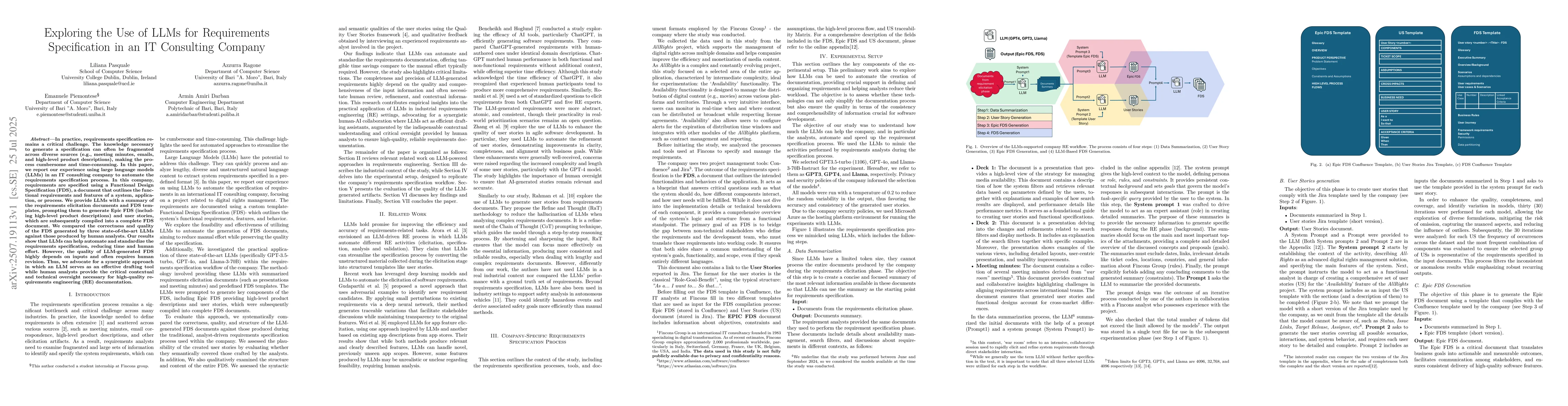In practice, requirements specification remains a critical challenge. The knowledge necessary to generate a specification can often be fragmented across diverse sources (e.g., meeting minutes, emails, and high-level product descriptions), making the process cumbersome and time-consuming. In this paper, we report our experience using large language models (LLMs) in an IT consulting company to automate the requirements specification process. In this company, requirements are specified using a Functional Design Specification (FDS), a document that outlines the functional requirements and features of a system, application, or process. We provide LLMs with a summary of the requirements elicitation documents and FDS templates, prompting them to generate Epic FDS (including high-level product descriptions) and user stories, which are subsequently compiled into a complete FDS document. We compared the correctness and quality of the FDS generated by three state-of-the-art LLMs against those produced by human analysts. Our results show that LLMs can help automate and standardize the requirements specification, reducing time and human effort. However, the quality of LLM-generated FDS highly depends on inputs and often requires human revision. Thus, we advocate for a synergistic approach in which an LLM serves as an effective drafting tool while human analysts provide the critical contextual and technical oversight necessary for high-quality requirements engineering (RE) documentation.
