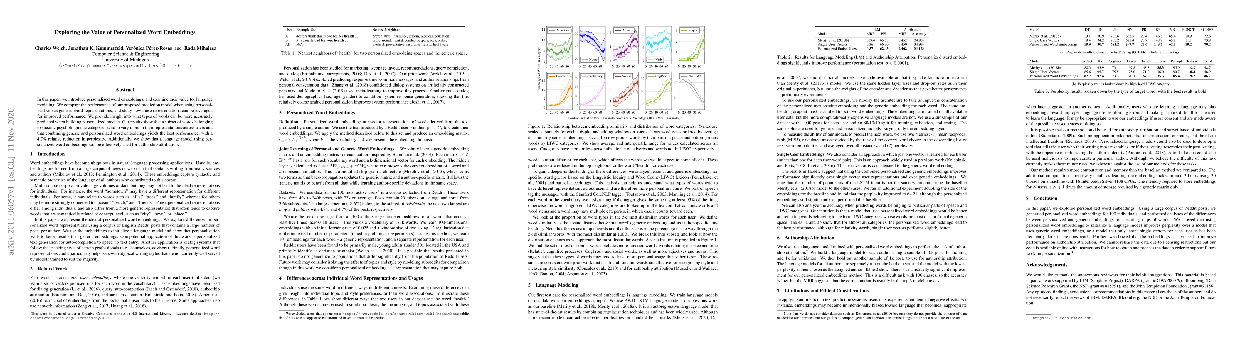 In this paper, we introduce personalized word embeddings, and examine their value for language modeling. We compare the performance of our proposed prediction model when using personalized versus generic word representations, and study how these representations can be leveraged for improved performance. We provide insight into what types of words can be more accurately predicted when building personalized models. Our results show that a subset of words belonging to specific psycholinguistic categories tend to vary more in their representations across users and that combining generic and personalized word embeddings yields the best performance, with a 4.7% relative reduction in perplexity. Additionally, we show that a language model using personalized word embeddings can be effectively used for authorship attribution.