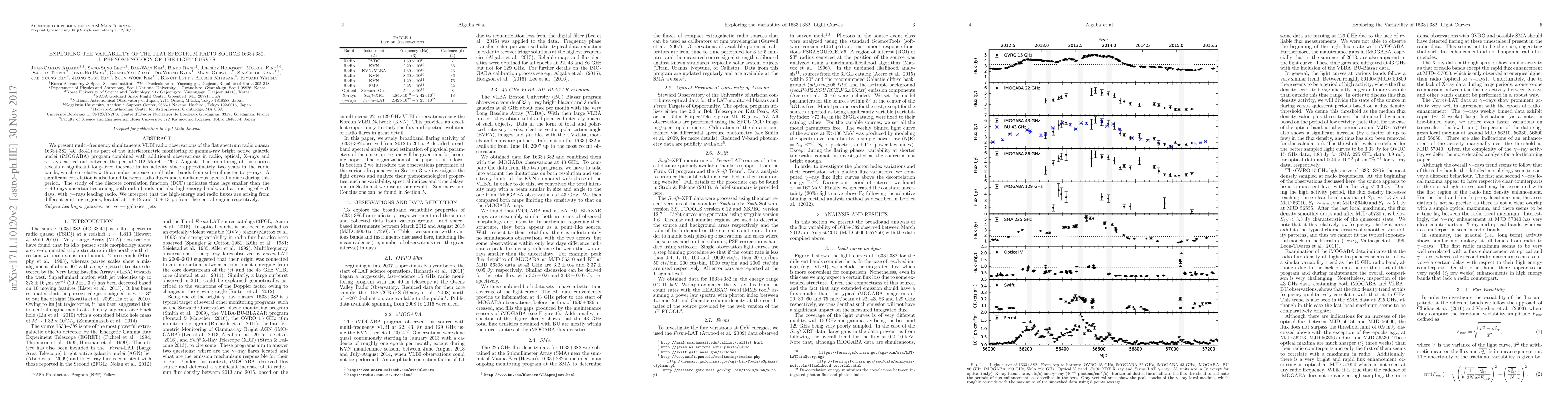 We present multi-frequency simultaneous VLBI radio observations of the flat spectrum radio quasar 1633+382 (4C~38.41) as part of the interferometric monitoring of gamma-ray bright active galactic nuclei (iMOGABA) program combined with additional observations in radio, optical, X-rays and $\gamma-$rays carried out between the period 2012 March - 2015 August. The monitoring of this source reveals a significant long-lived increase in its activity since approximately two years in the radio bands, which correlates with a similar increase on all other bands from sub-millimeter to $\gamma-$rays. A significant correlation is also found between radio fluxes and simultaneous spectral indices during this period. The study of the discrete correlation function (DCF) indicates time lags smaller than the $\sim40$ days uncertainties among both radio bands and also high-energy bands, and a time lag of $\sim$70 days, with $\gamma-$rays leading radio. We interpret that the high-energy and radio fluxes are arising from different emitting regions, located at $1\pm12$ and $40\pm13$ pc from the central engine respectively.