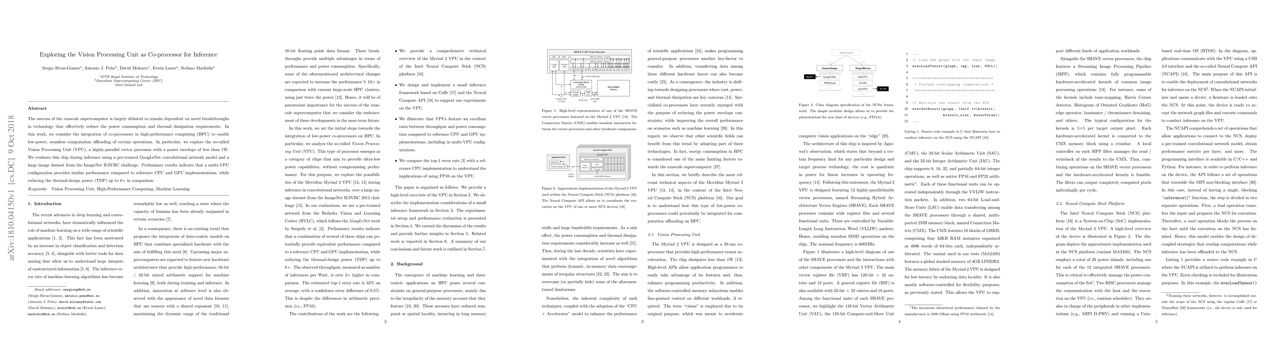 The success of the exascale supercomputer is largely debated to remain dependent on novel breakthroughs in technology that effectively reduce the power consumption and thermal dissipation requirements. In this work, we consider the integration of co-processors in high-performance computing (HPC) to enable low-power, seamless computation offloading of certain operations. In particular, we explore the so-called Vision Processing Unit (VPU), a highly-parallel vector processor with a power envelope of less than 1W. We evaluate this chip during inference using a pre-trained GoogLeNet convolutional network model and a large image dataset from the ImageNet ILSVRC challenge. Preliminary results indicate that a multi-VPU configuration provides similar performance compared to reference CPU and GPU implementations, while reducing the thermal-design power (TDP) up to 8x in comparison.