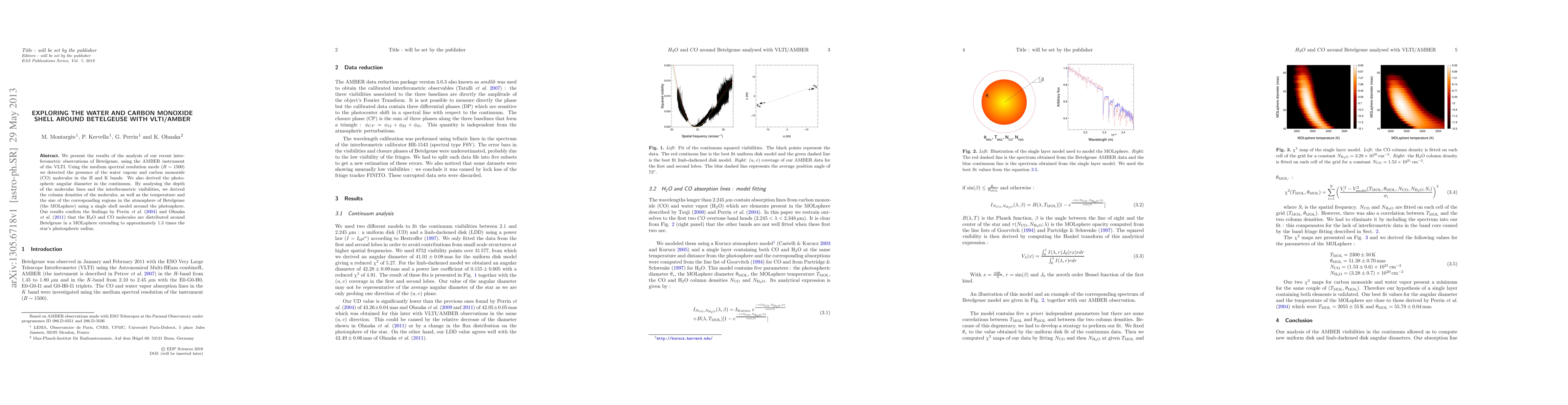 This paper reports on interferometric observations of Betelgeuse using the VLTI/AMBER instrument, detecting water vapor and carbon monoxide in the star's atmosphere. The study derives the column densities and temperature of these molecules, confirming a MOLsphere extending to 1.3 times the photospheric radius.