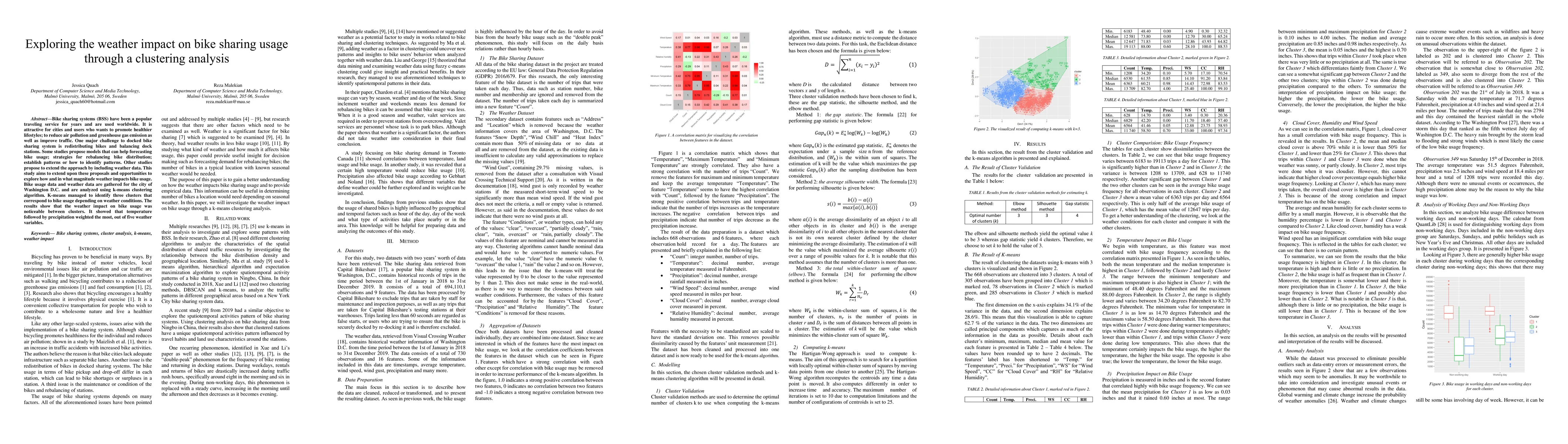 This study investigates the influence of weather on bike sharing usage in Washington D.C. using k-means clustering, identifying three usage patterns based on weather conditions, with temperature and precipitation being the most significant factors.