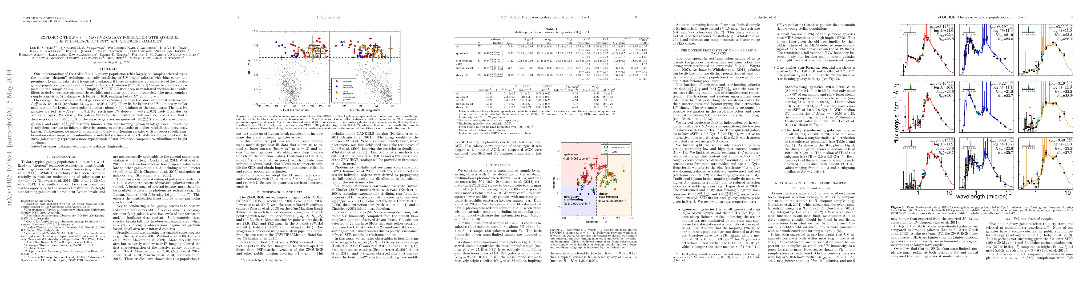 This study using the ZFOURGE Survey reveals that massive galaxies at $z=3-4$ are diverse, with a significant population of quiescent and dusty star-forming galaxies, challenging the notion that these galaxies are solely UV-bright and star-forming. The sample shows a substantial number of dusty galaxies with lower star-formation rates compared to submillimeter-selected starbursts.