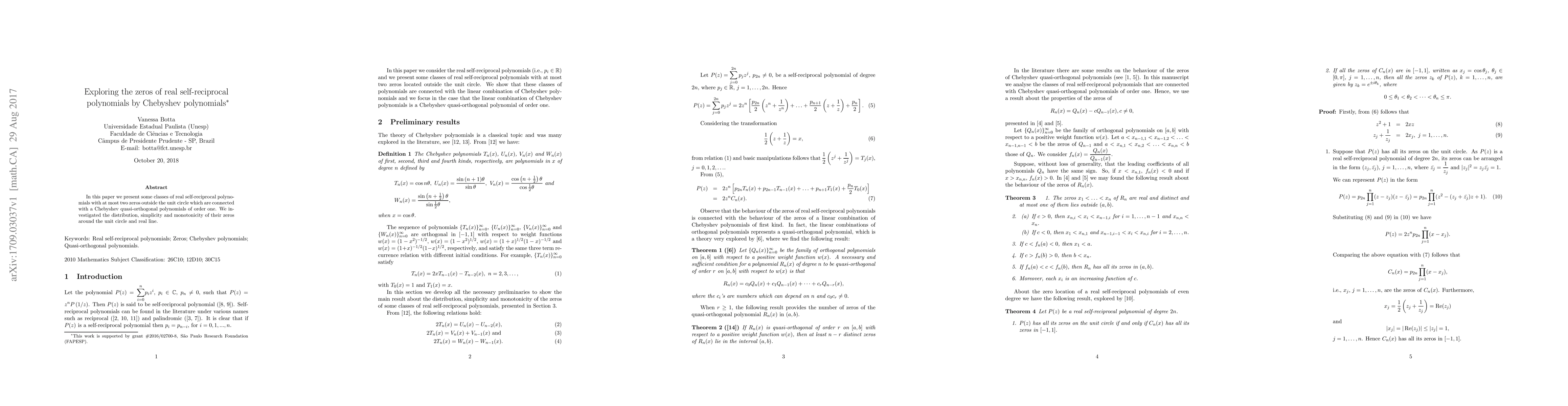 Summary: This paper investigates classes of real self-reciprocal polynomials linked to Chebyshev quasi-orthogonal polynomials, focusing on the distribution, simplicity, and monotonicity of their zeros, especially those located outside the unit circle.