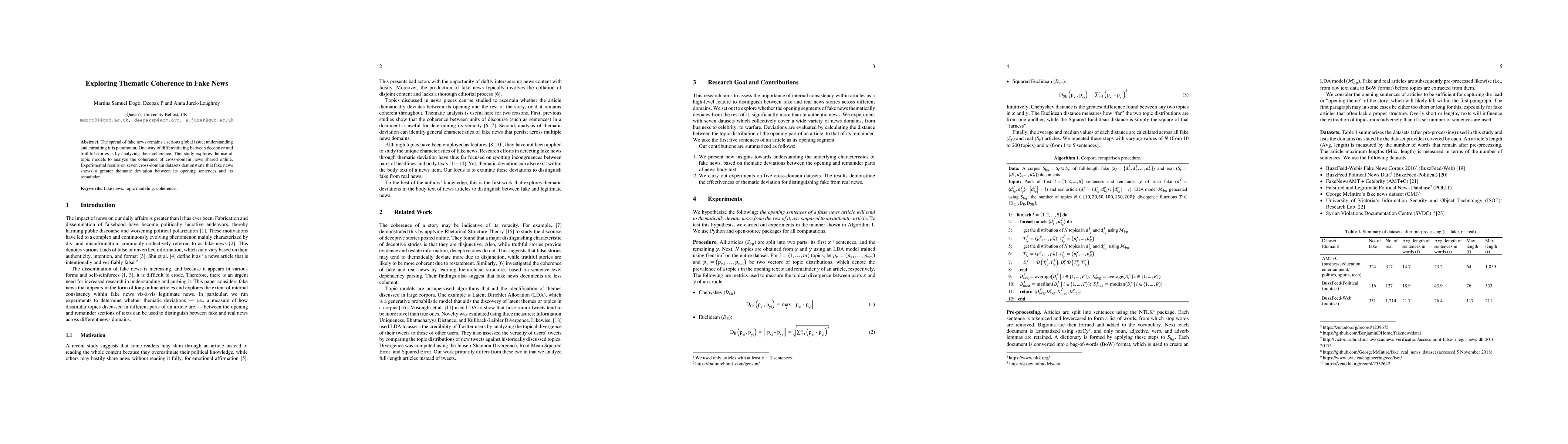 The spread of fake news remains a serious global issue; understanding and curtailing it is paramount. One way of differentiating between deceptive and truthful stories is by analyzing their coherence. This study explores the use of topic models to analyze the coherence of cross-domain news shared online. Experimental results on seven cross-domain datasets demonstrate that fake news shows a greater thematic deviation between its opening sentences and its remainder.