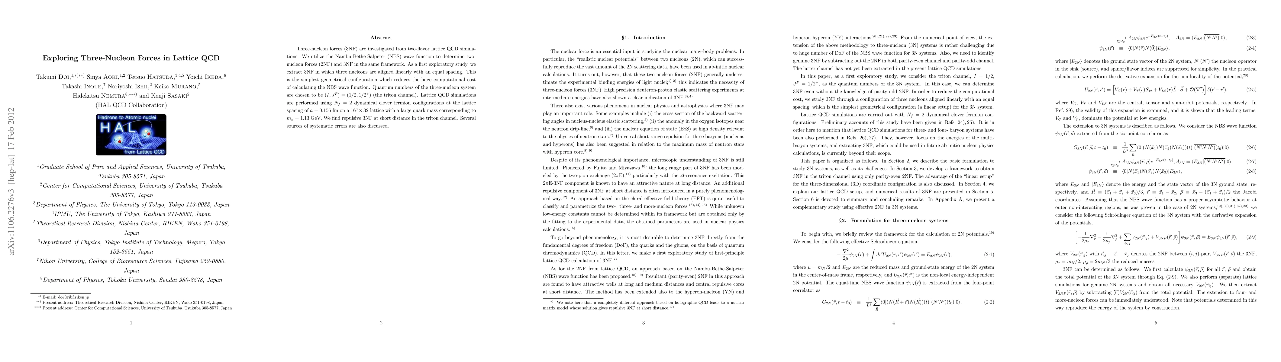 This study explores three-nucleon forces (3NF) using two-flavor lattice QCD simulations, employing the Nambu-Bethe-Salpeter wave function to determine both 2NF and 3NF. The simplest linear configuration of three nucleons is examined, revealing repulsive 3NF at short distances in the triton channel, with discussions on systematic errors.