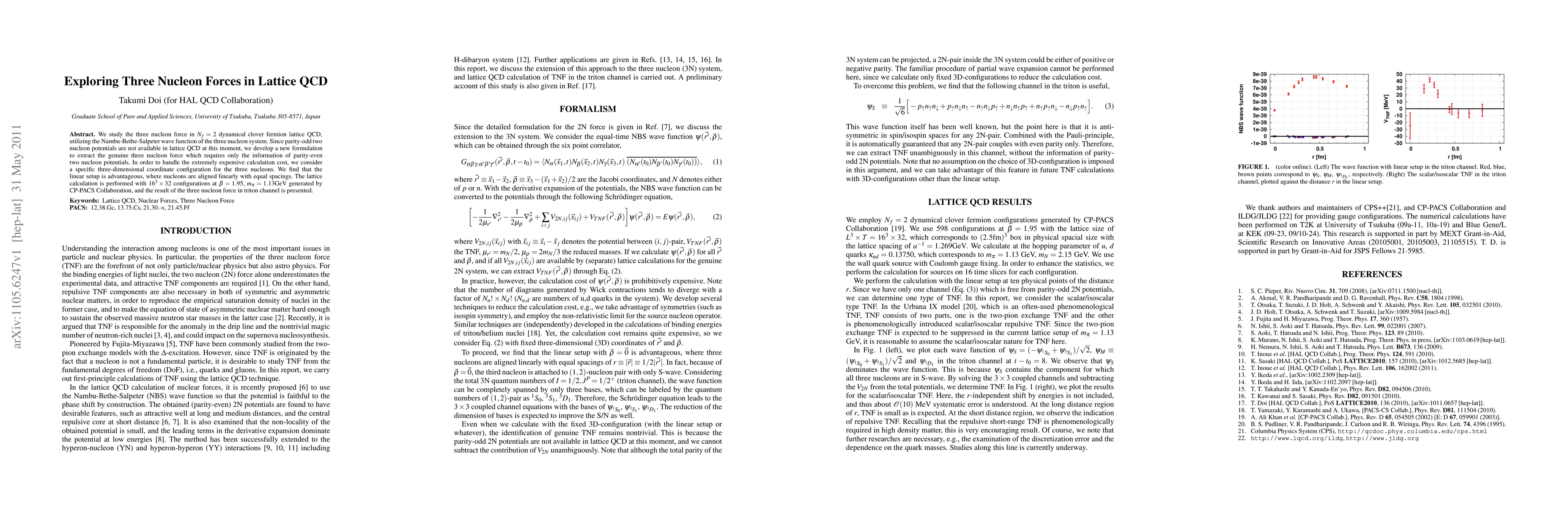 We study the three nucleon force in Nf=2 dynamical clover fermion lattice QCD, utilizing the Nambu-Bethe-Salpeter wave function of the three nucleon system. Since parity-odd two nucleon potentials are not available in lattice QCD at this moment, we develop a new formulation to extract the genuine three nucleon force which requires only the information of parity-even two nucleon potentials. In order to handle the extremely expensive calculation cost, we consider a specific three-dimensional coordinate configuration for the three nucleons. We find that the linear setup is advantageous, where nucleons are aligned linearly with equal spacings. The lattice calculation is performed with 16^3 x 32 configurations at \beta=1.95, m_\pi=1.13 GeV generated by CP-PACS Collaboration, and the result of the three nucleon force in triton channel is presented.