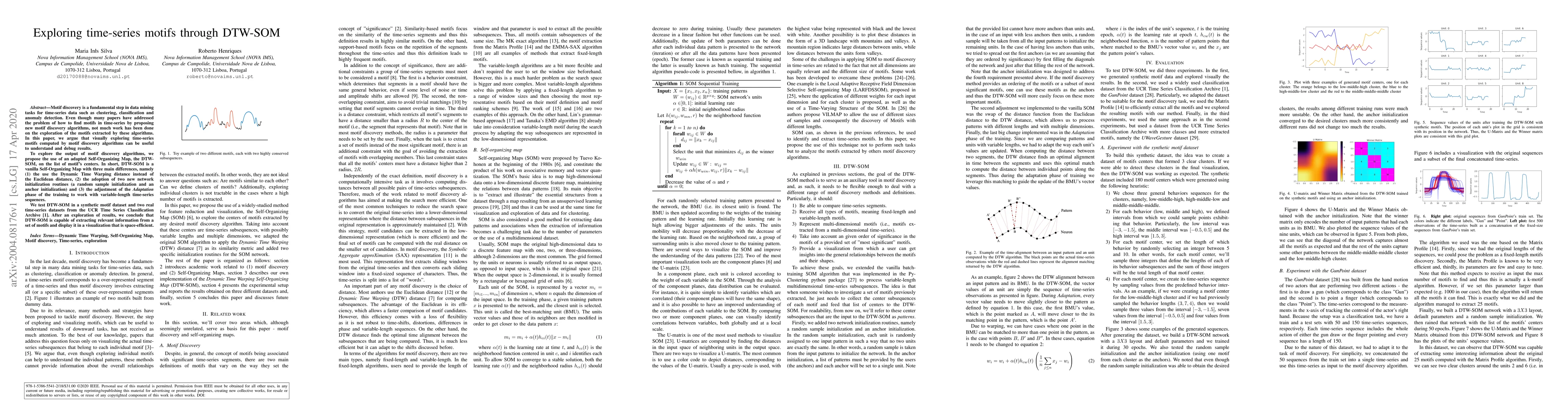 This paper proposes DTW-SOM, an adapted Self-Organizing Map using Dynamic Time Warping for exploring motifs in time-series data, featuring unique initialization and adaptation phases. Tests on synthetic and real datasets show DTW-SOM effectively visualizes and organizes motif centers for better understanding and debugging.
