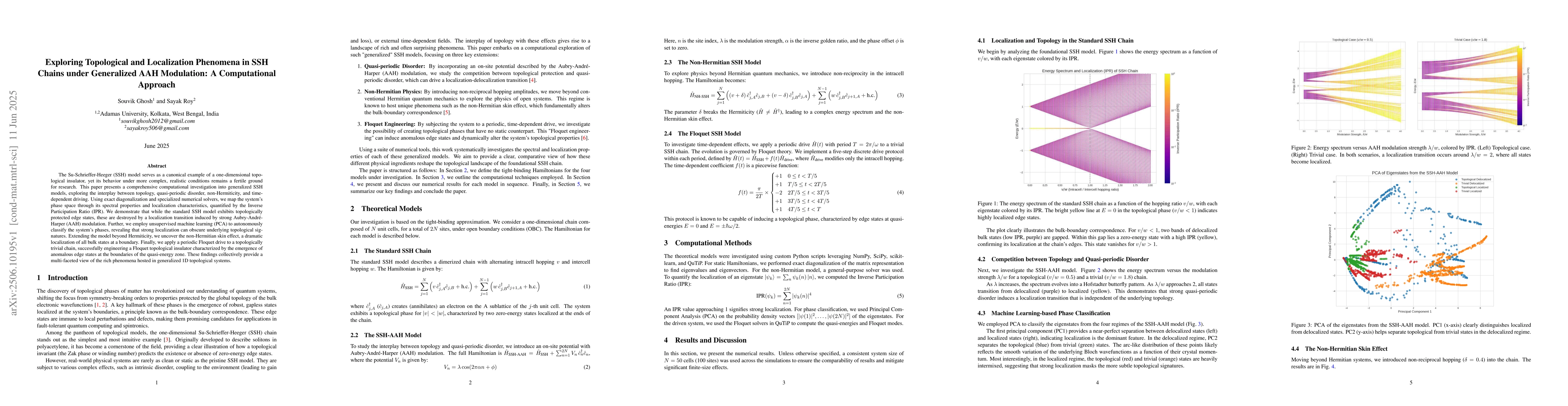 The Su-Schrieffer-Heeger (SSH) model serves as a canonical example of a one-dimensional topological insulator, yet its behavior under more complex, realistic conditions remains a fertile ground for research. This paper presents a comprehensive computational investigation into generalized SSH models, exploring the interplay between topology, quasi-periodic disorder, non-Hermiticity, and time-dependent driving. Using exact diagonalization and specialized numerical solvers, we map the system's phase space through its spectral properties and localization characteristics, quantified by the Inverse Participation Ratio (IPR). We demonstrate that while the standard SSH model exhibits topologically protected edge states, these are destroyed by a localization transition induced by strong Aubry-Andr\'e-Harper (AAH) modulation. Further, we employ unsupervised machine learning (PCA) to autonomously classify the system's phases, revealing that strong localization can obscure underlying topological signatures. Extending the model beyond Hermiticity, we uncover the non-Hermitian skin effect, a dramatic localization of all bulk states at a boundary. Finally, we apply a periodic Floquet drive to a topologically trivial chain, successfully engineering a Floquet topological insulator characterized by the emergence of anomalous edge states at the boundaries of the quasi-energy zone. These findings collectively provide a multi-faceted view of the rich phenomena hosted in generalized 1D topological systems.