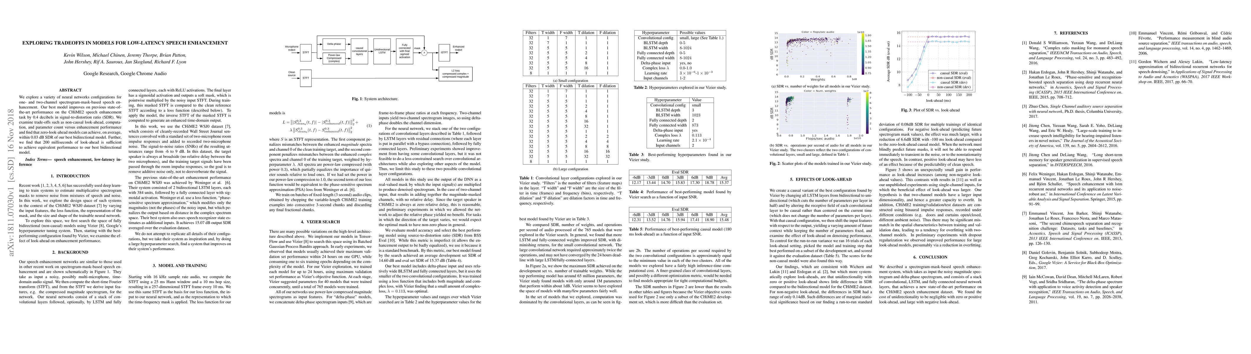 We explore a variety of neural networks configurations for one- and two-channel spectrogram-mask-based speech enhancement. Our best model improves on previous state-of-the-art performance on the CHiME2 speech enhancement task by 0.4 decibels in signal-to-distortion ratio (SDR). We examine trade-offs such as non-causal look-ahead, computation, and parameter count versus enhancement performance and find that zero-look-ahead models can achieve, on average, within 0.03 dB SDR of our best bidirectional model. Further, we find that 200 milliseconds of look-ahead is sufficient to achieve equivalent performance to our best bidirectional model.