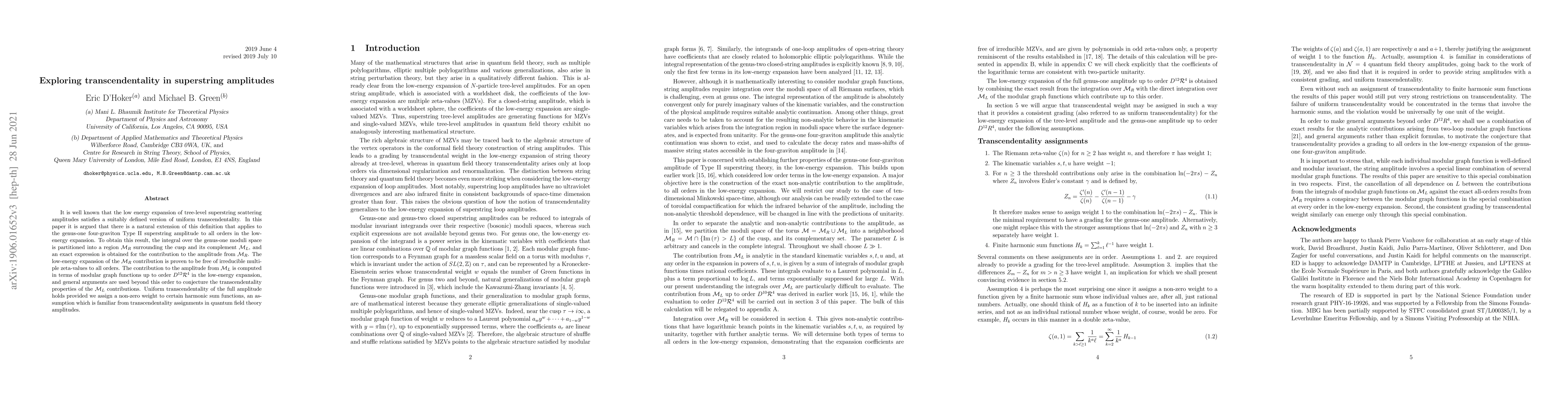 It is well known that the low energy expansion of tree-level superstring scattering amplitudes satisfies a suitably defined version of maximum transcendentality. In this paper it is argued that there is a natural extension of this definition that applies to the genus-one four-graviton Type II superstring amplitude to all orders in the low-energy expansion. To obtain this result, the integral over the genus-one moduli space is partitioned into a region ${\cal M}_R$ surrounding the cusp and its complement ${\cal M}_L$, and an exact expression is obtained for the contribution to the amplitude from ${\cal M}_R$. The low-energy expansion of the ${\cal M}_R$ contribution is proven to be free of irreducible multiple zeta-values to all orders. The contribution to the amplitude from ${\cal M}_L$ is computed in terms of modular graph functions up to order $D^{12} {\cal R}^4$ in the low-energy expansion, and general arguments are used beyond this order to conjecture the transcendentality properties of the ${\cal M}_L$ contributions. Maximal transcendentality of the full amplitude holds provided we assign a non-zero weight to certain harmonic sums, an assumption which is familiar from transcendentality assignments in quantum field theory amplitudes.