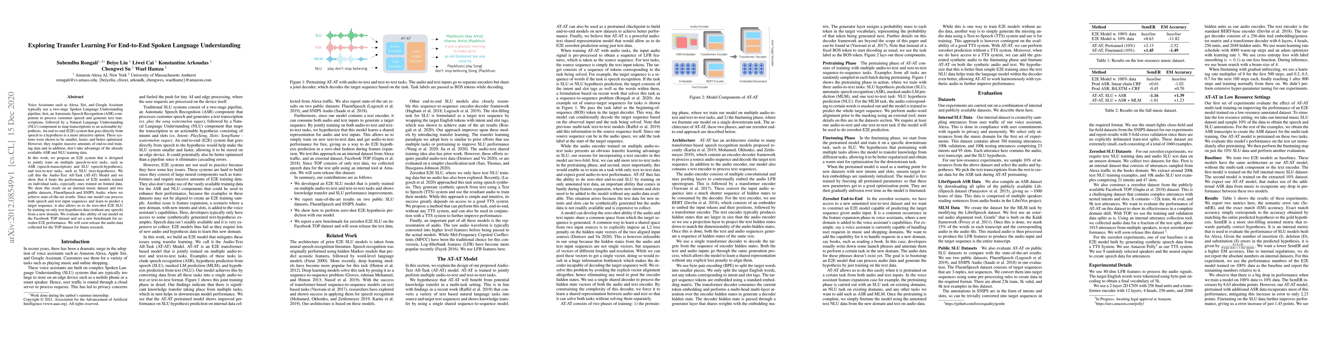 Researchers developed an end-to-end Spoken Language Understanding model that outperforms individual task-based models, especially on limited data, and achieves state-of-the-art results in several datasets.