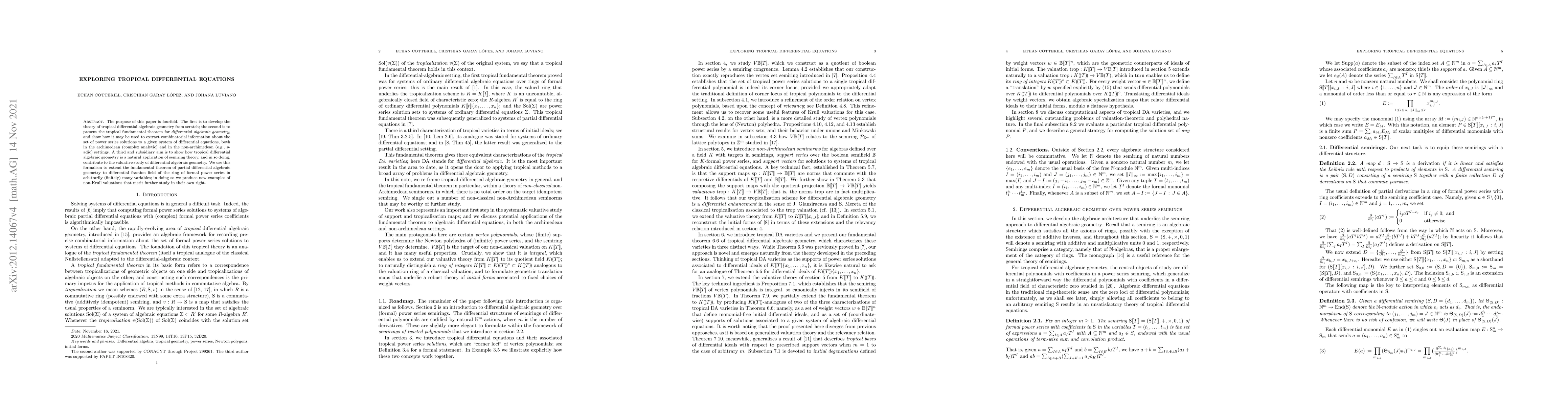 The purpose of this paper is fourfold. The first is to develop the theory of tropical differential algebraic geometry from scratch; the second is to present the tropical fundamental theorem for differential algebraic geometry, and show how it may be used to extract combinatorial information about the set of power series solutions to a given system of differential equations, both in the archimedean (complex analytic) and in the non-archimedean (e.g., $p$-adic) settings. A third and subsidiary aim is to show how tropical differential algebraic geometry is a natural application of semiring theory, and in so doing, contribute to the valuative study of differential algebraic geometry. We use this formalism to extend the fundamental theorem of partial differential algebraic geometry to the differential fraction field of the ring of formal power series in arbitrarily (finitely) many variables; in doing so we produce new examples of non-Krull valuations that merit further study in their own right.