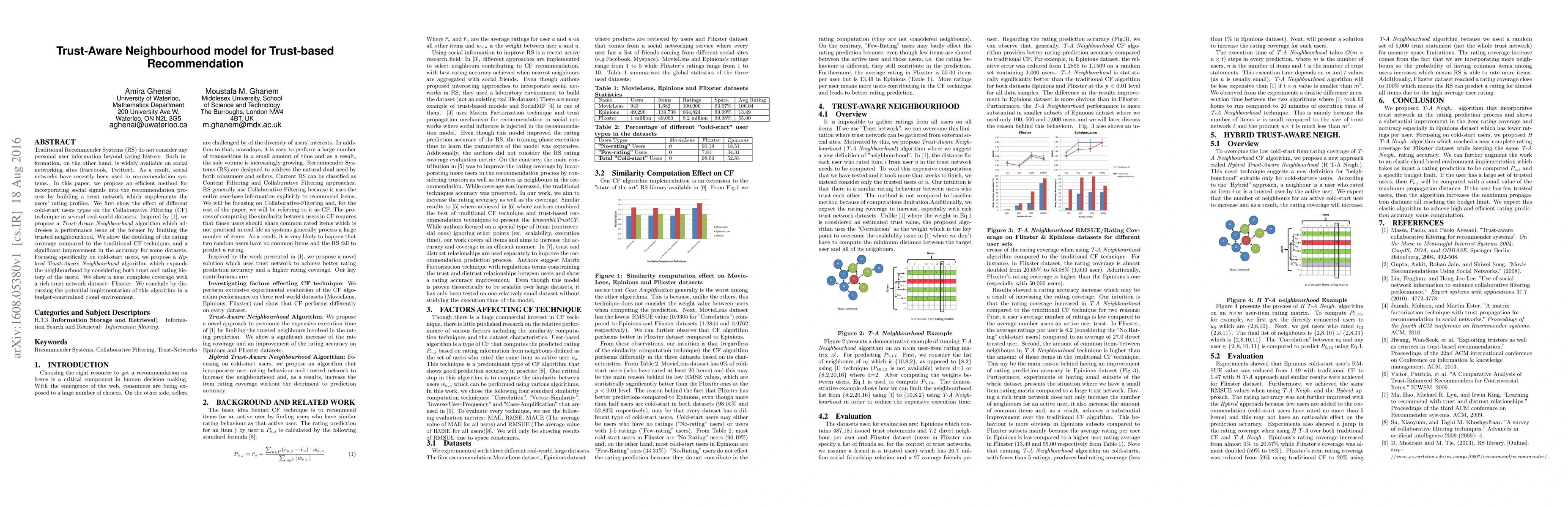 Traditional Recommender Systems (RS) do not consider any personal user information beyond rating history. Such information, on the other hand, is widely available on social networking sites (Facebook, Twitter). As a result, social networks have recently been used in recommendation systems. In this paper, we propose an efficient method for incorporating social signals into the recommendation process by building a trust network which supplements the users' rating profiles. We first show the effect of different cold-start users types on the Collaborative Filtering (CF) technique in several real-world datasets. Later, we propose a "Trust-Aware Neighbourhood" algorithm which addresses a performance issue of the former by limiting the trusted neighbourhood. We show the doubling of the rating coverage compared to the traditional CF technique, and a significant improvement in the accuracy for some datasets. Focusing specifically on cold-start users, we propose a "Hybrid Trust-Aware Neighbourhood" algorithm which expands the neighbourhood by considering both trust and rating history of the users. We show a near complete coverage with a rich trust network dataset-- Flixster. We conclude by discussing the potential implementation of this algorithm in a budget-constrained cloud environment.