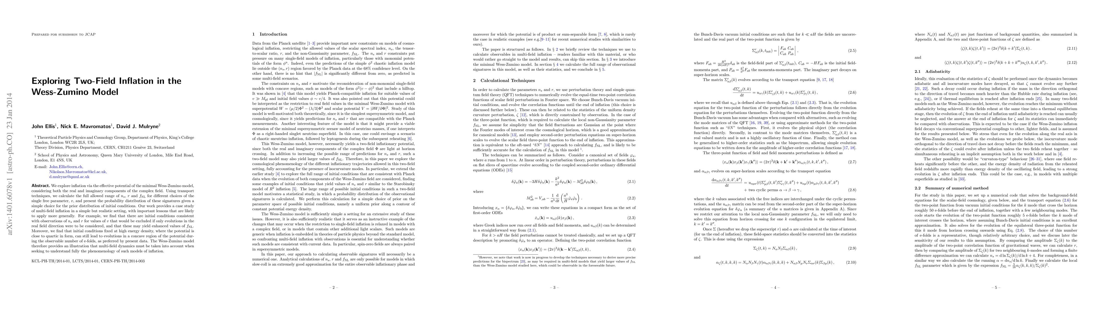 We explore inflation via the effective potential of the minimal Wess-Zumino model, considering both the real and imaginary components of the complex field. Using transport techniques, we calculate the full allowed range of $n_s$, $r$ and $f_{\rm NL}$ for different choices of the single free parameter, $v$, and present the probability distribution of these signatures given a simple choice for the prior distribution of initial conditions. Our work provides a case study of multi-field inflation in a simple but realistic setting, with important lessons that are likely to apply more generally. For example, we find that there are initial conditions consistent with observations of $n_s$ and $r$ for values of $v$ that would be excluded if only evolutions in the real field direction were to be considered, and that these may yield enhanced values of $f_{\rm NL}$. Moreover, we find that initial conditions fixed at high energy density, where the potential is close to quartic in form, can still lead to evolutions in a concave region of the potential during the observable number of e-folds, as preferred by present data. The Wess-Zumino model therefore provides an illustration that multi-field dynamics must be taken into account when seeking to understand fully the phenomenology of such models of inflation.