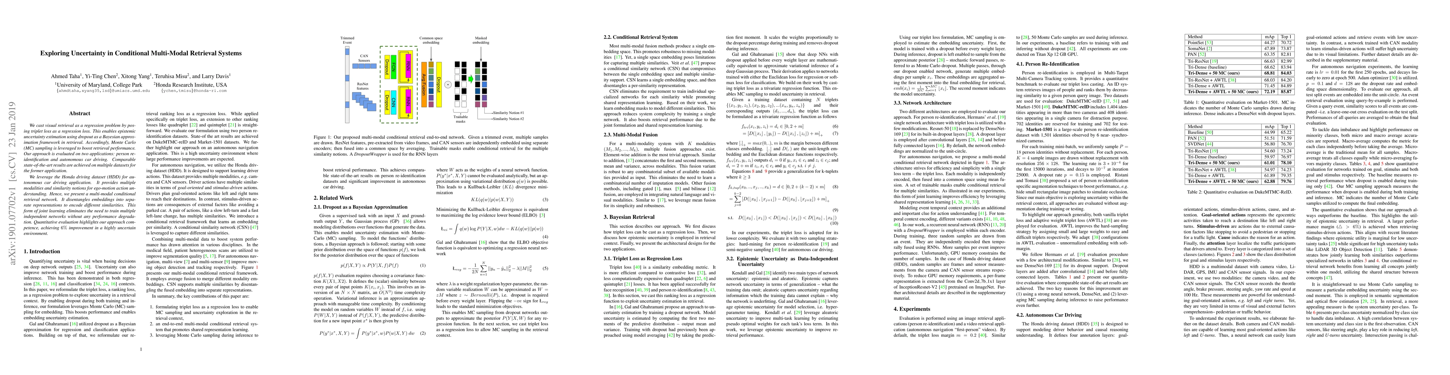 We cast visual retrieval as a regression problem by posing triplet loss as a regression loss. This enables epistemic uncertainty estimation using dropout as a Bayesian approximation framework in retrieval. Accordingly, Monte Carlo (MC) sampling is leveraged to boost retrieval performance. Our approach is evaluated on two applications: person re-identification and autonomous car driving. Comparable state-of-the-art results are achieved on multiple datasets for the former application. We leverage the Honda driving dataset (HDD) for autonomous car driving application. It provides multiple modalities and similarity notions for ego-motion action understanding. Hence, we present a multi-modal conditional retrieval network. It disentangles embeddings into separate representations to encode different similarities. This form of joint learning eliminates the need to train multiple independent networks without any performance degradation. Quantitative evaluation highlights our approach competence, achieving 6% improvement in a highly uncertain environment.