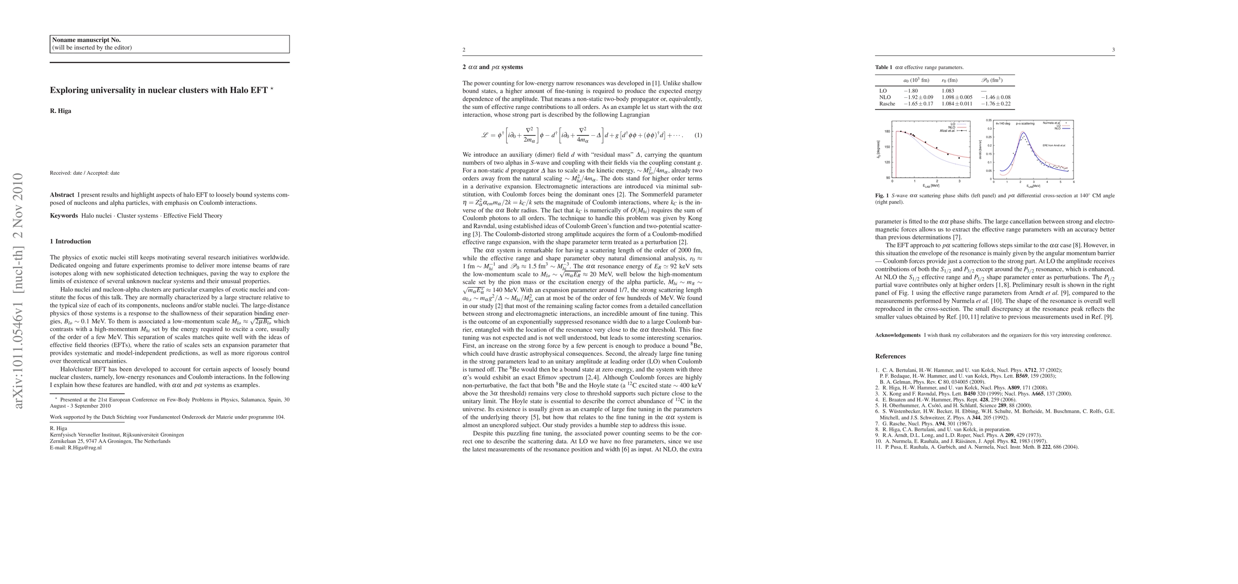 Summary: This paper investigates the application of Halo Effective Field Theory (EFT) to nuclear clusters, focusing on loosely bound systems of nucleons and alpha particles, with particular attention to the role of Coulomb interactions in determining universality.