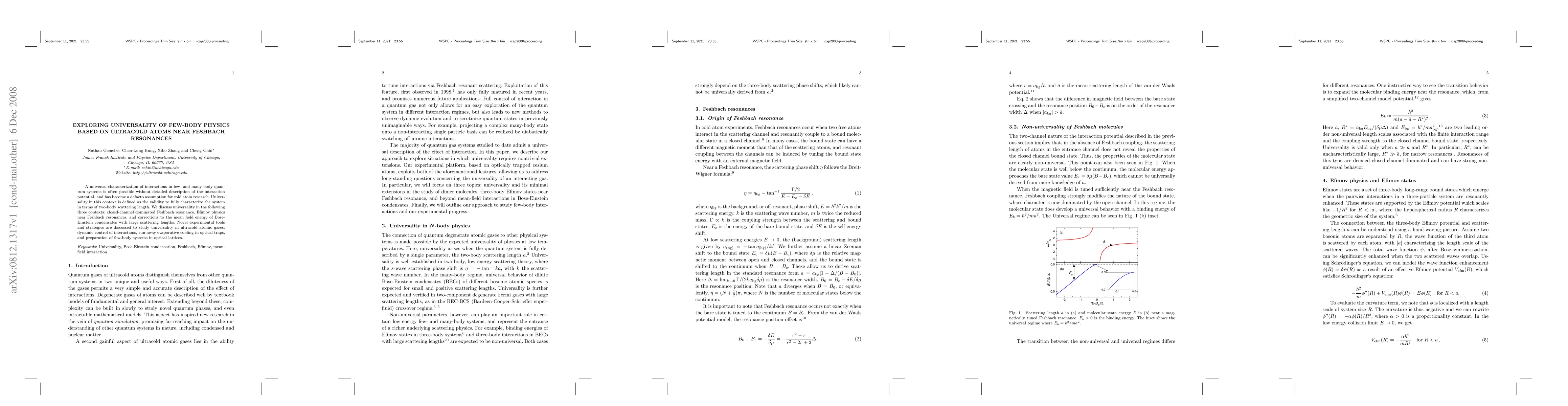 This paper explores the universality of few-body physics in ultracold atoms near Feshbach resonances, focusing on characterizing interactions via two-body scattering length. It examines closed-channel dominated Feshbach resonances, Efimov physics, and corrections to mean field energy, proposing novel experimental techniques for studying these phenomena.