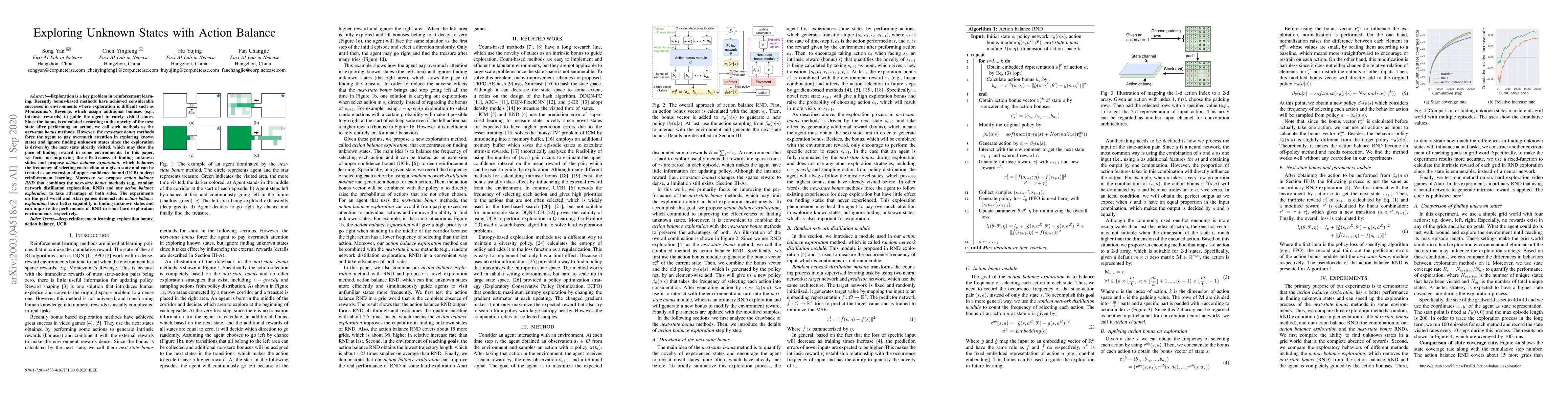 Exploration is a key problem in reinforcement learning. Recently bonus-based methods have achieved considerable successes in environments where exploration is difficult such as Montezuma's Revenge, which assign additional bonuses (e.g., intrinsic rewards) to guide the agent to rarely visited states. Since the bonus is calculated according to the novelty of the next state after performing an action, we call such methods as the next-state bonus methods. However, the next-state bonus methods force the agent to pay overmuch attention in exploring known states and ignore finding unknown states since the exploration is driven by the next state already visited, which may slow the pace of finding reward in some environments. In this paper, we focus on improving the effectiveness of finding unknown states and propose action balance exploration, which balances the frequency of selecting each action at a given state and can be treated as an extension of upper confidence bound (UCB) to deep reinforcement learning. Moreover, we propose action balance RND that combines the next-state bonus methods (e.g., random network distillation exploration, RND) and our action balance exploration to take advantage of both sides. The experiments on the grid world and Atari games demonstrate action balance exploration has a better capability in finding unknown states and can improve the performance of RND in some hard exploration environments respectively.