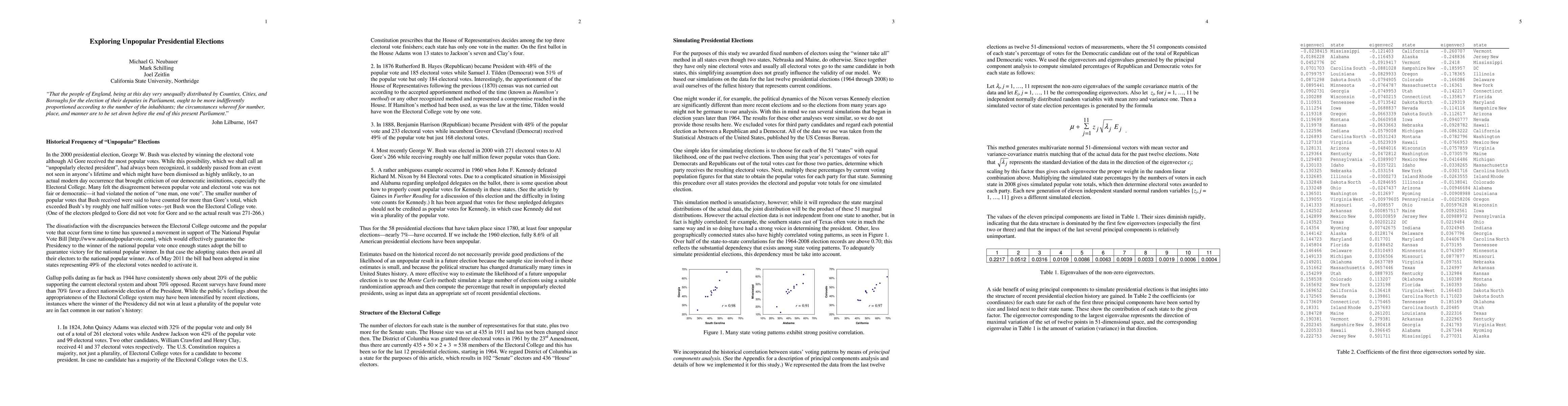 There have been several instances in our nation's history in which the presidential candidate who received the most popular votes did not win the presidency. Using a principal components analysis of recent presidential elections, we estimate the likelihood of such an outcome under modern conditions to be approximately 5%. We also investigate the effect on this estimate of eliminating from the Electoral College the two electors per state awarded due to their representation in the Senate, as well as the effect of increasing them. We conclude with an analysis of the likely consequences of The National Popular Vote Bill, which would award the presidency to the candidate with the largest national popular vote total if it took effect.