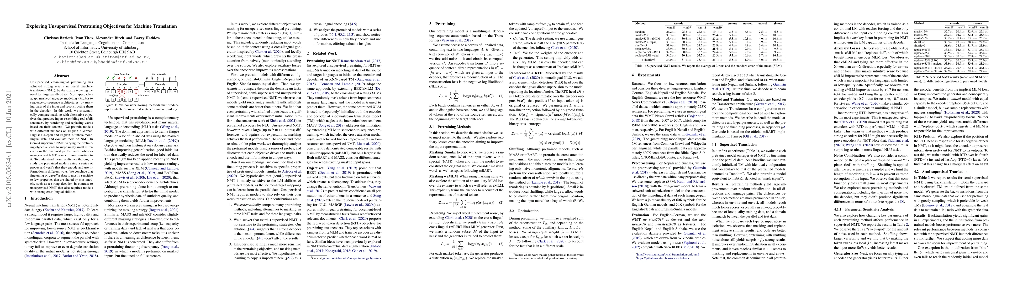 This paper investigates various unsupervised pretraining objectives for neural machine translation, comparing masked-language modeling to alternatives that reorder and replace words. It finds that while different objectives lead to minor differences in supervised NMT, they significantly impact unsupervised NMT performance, highlighting the importance of cross-lingual abilities in the latter.
