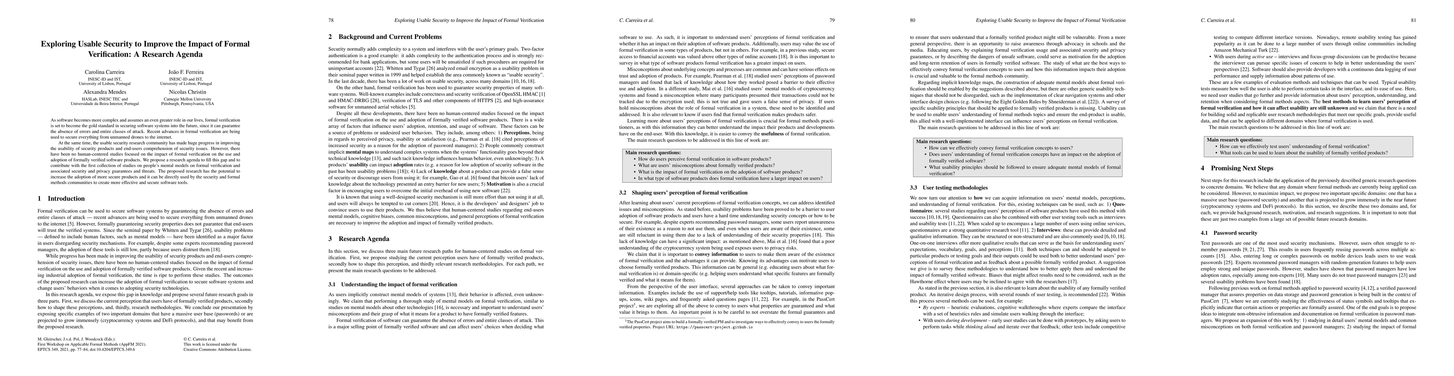 This paper proposes a research agenda to investigate the usability of formal verification in software systems, aiming to bridge the gap between formal verification and usable security. It seeks to understand users' mental models of formal verification and its security guarantees, with the goal of enhancing the adoption of secure software products.